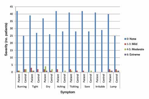 Patients Controls p Value Mean Range Mean Range Burning 0.16 ± 0.805 0-5 0.48 ± 1.299 0-5 0.163 Tight 0.36 ± 1.222 0-6 0.17 ± 0 .658 0-3 0.529 dry 0.64 ± 1.586 0-6 0.41 ± 1.268 0-5 0.497 Aching 0.11 ± 0.538 0-3 0.14 ± 0 .743 0-4 0.844 Tickling 0.23 ± 0.922 0-5 0.07 ± 0.371 0-2 0.506 Sore 0.07 ± 0.457 0-3 0.14 ± 0.743 0-4 0.762 Irritable 0.14 ± 0.554 0-3 0.00 ± .000 0-0 0.154 Lump 0.32 ± 1.137 0-6 0.52 ± 1.430 0-6 0.519 Total 2.02 ± 4.967 0-25 1.93 ± 3.954 0-20 0.420