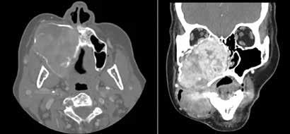Figure. Axial (A) and coronal (B) views show the large, enhancing mass centered in the right maxillary sinus with local invasion and protrusion into the oral cavity.