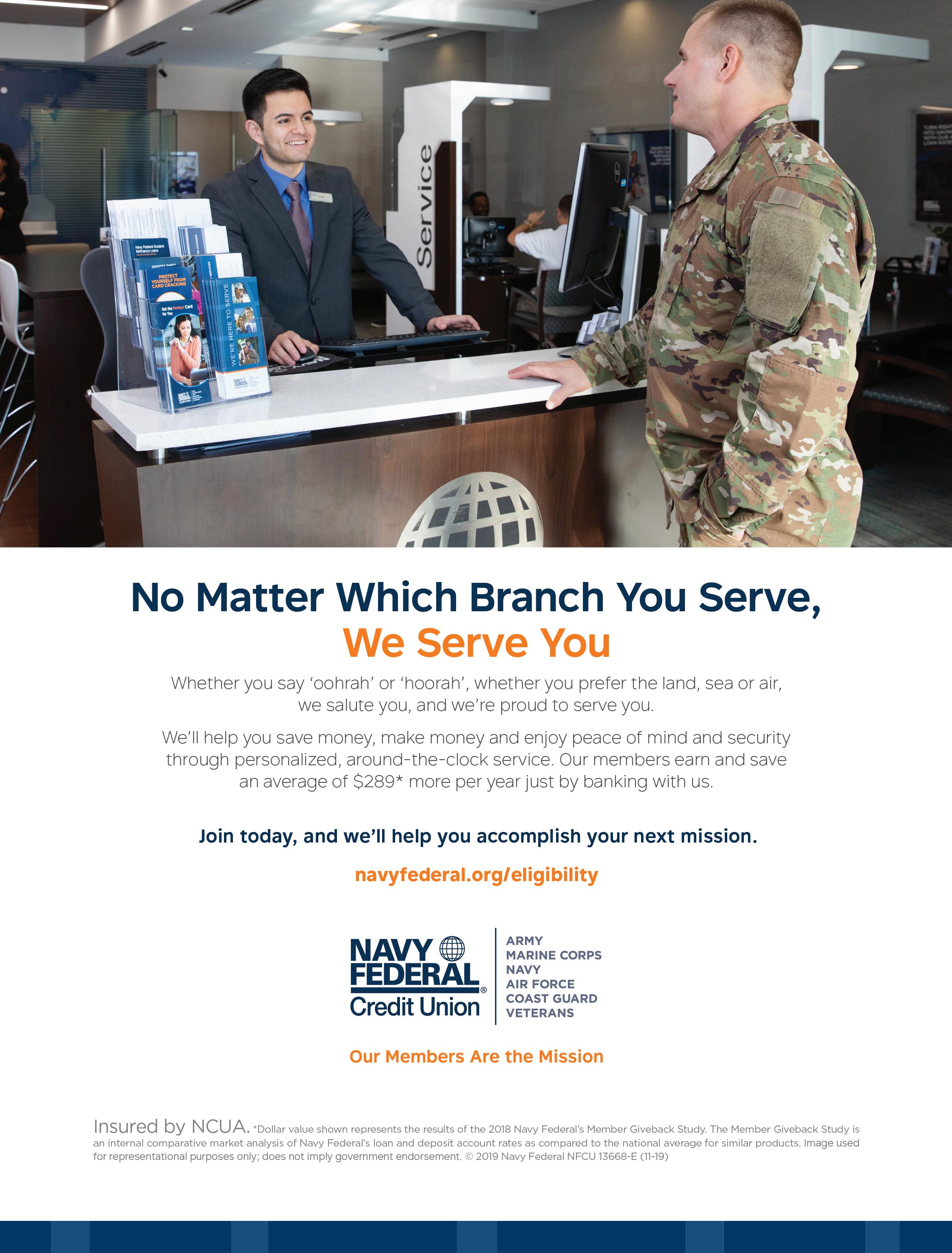 MADE FOR THE MILITARY Join USAA USAA.COM/JOIN or call 800-531-8521 No Department of Defense or government agency endorsement. Member eligibility and product restrictions apply and are subject to change. USAA means United Services Automobile Association and its affiliates. © 2019 USAA. 266289-1019 ™ For nearly 100 years, we’ve served military members. We not only understand your needs — we share your values. You’ll see it in our products and services tailored for military life. T:9.75”
