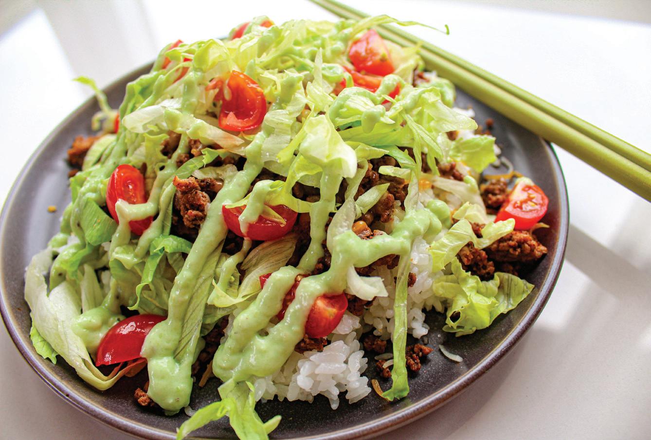 Taco rice is a dish that originated in Okinawa years ago as a way to attract hungry U.S. troops to local dining establishments. Restaurant owners took the popular seasoned ground beef taco filling and loaded it on a bed of lettuce, served with cheese and tomatoes. This version contains all of the original components, but adds a lime avocado cream sauce to boot!