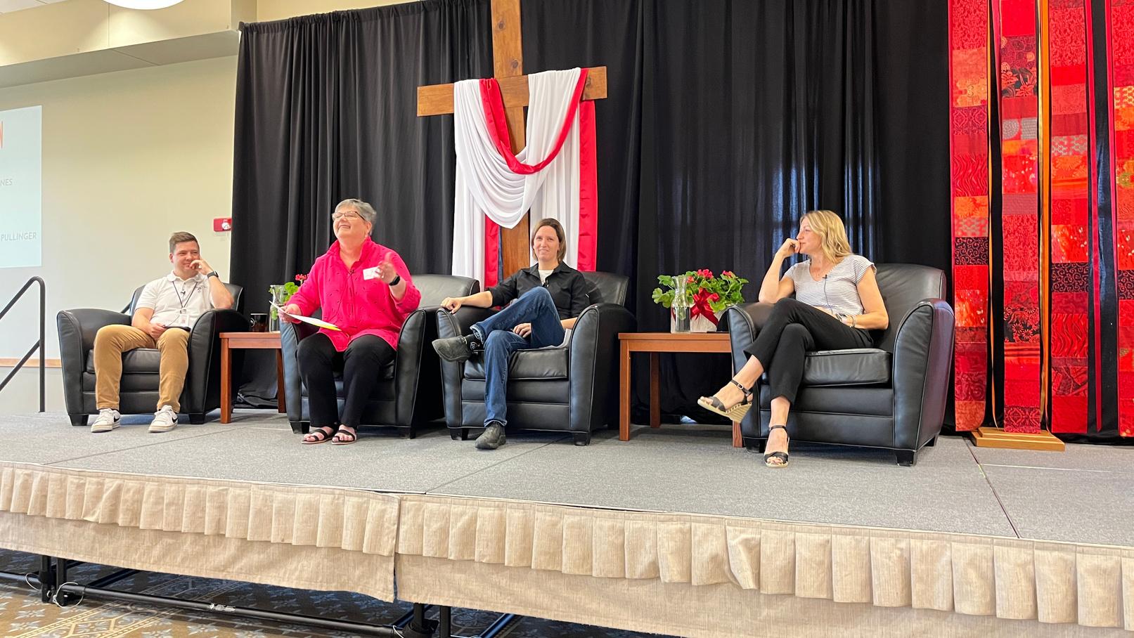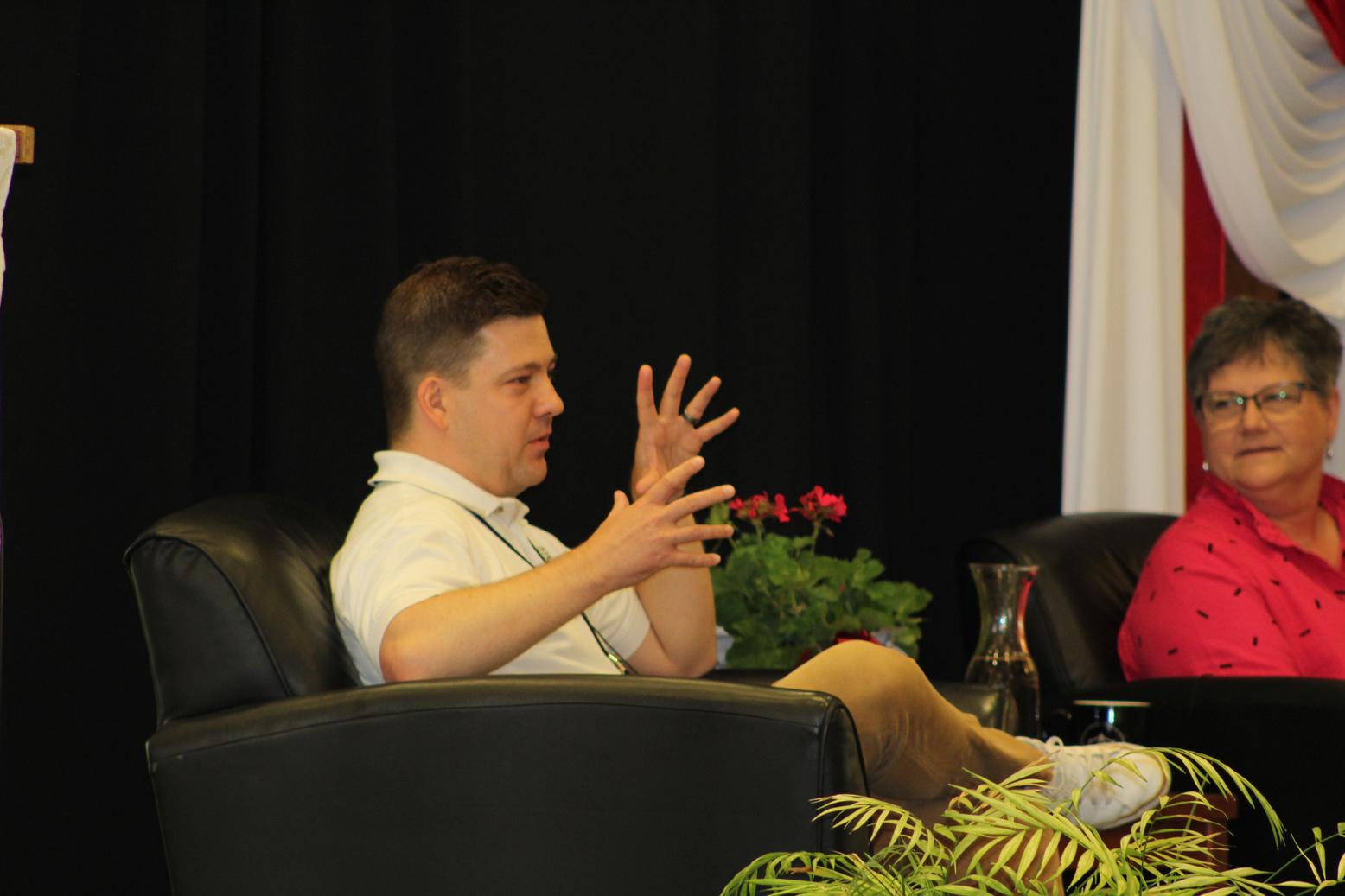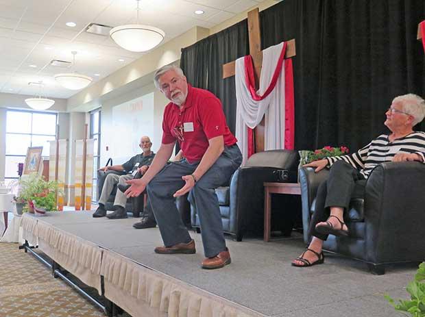 To welcome people and to make them feel as if they belong, “we need to get into the fielding position,” said John Cooper, pastoral associate and business manager at St. Anthony Parish-Davenport, as he crouched into position to demonstrate. He shared his insights on welcoming and belonging during the first of three panels held during the diocesan Synodal Summit on June 17 at St. Ambrose University. Each panel addressed a dimension of the Synod of Bishops communion, participation and mission. Cooper, Colleen Burke of the St. Patrick cluster of five parishes in Clinton County, Deacon Frank Agnoli, diocesan director of liturgy, and Dan Ebener, diocesan director of pastoral planning, spoke on communion.