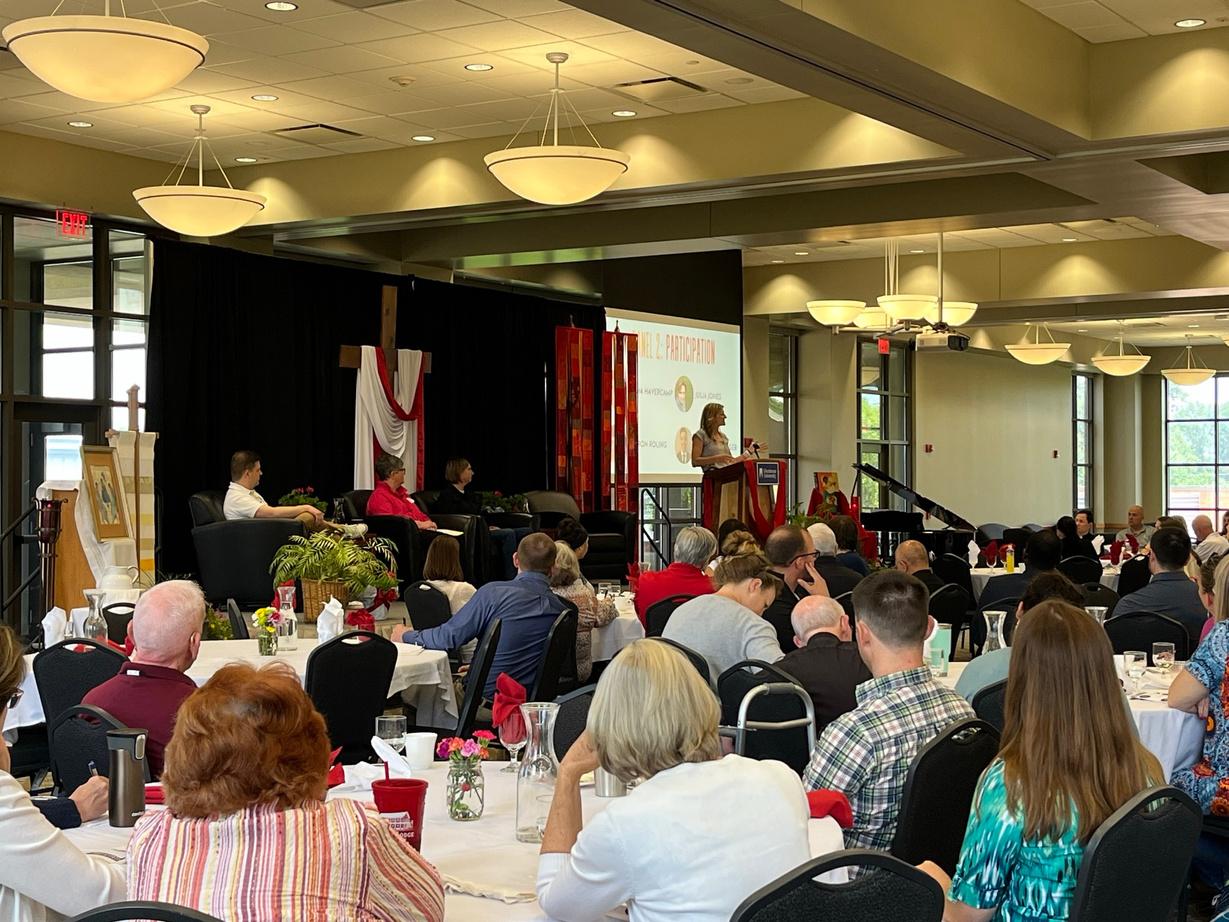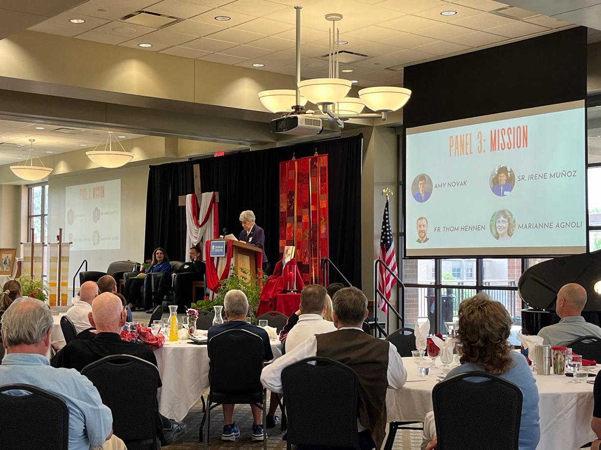 In his welcoming address, Bishop Thomas Zinkula summarized the universal Synod of Bishops, which Pope Francis commissioned in 2021 and which took the unusual step of seeking input from the laity about the future of the Catholic Church. The Synod began with listening sessions worldwide that addressed three dimensions communion, participation and mission and resulted in national, continental and universal reports that the Synod of Bishops will address in October of this year and again next year.