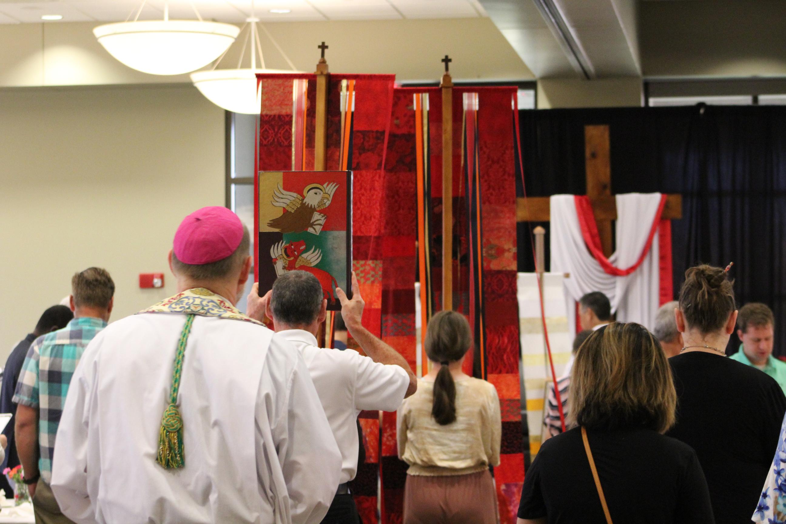 Catholics carrying banners, the Book of the Gospels and an icon of the most Holy Trinity led a procession into the Rogalski Center of St. Ambrose University for the Diocese of Davenport’s Synodal Summit on June 17