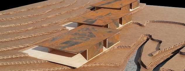 Staying humble to the landscape and surrounding environment the proposed structure touches the earth lightly. Cor-ten steal blends into the landscape weathering gradually acting as a barrier from the specific climate of the region. Openings offer specific experiential views and elude that it isn’t even there, not taking from what exists but enhancing the overall experience of the gliderport.