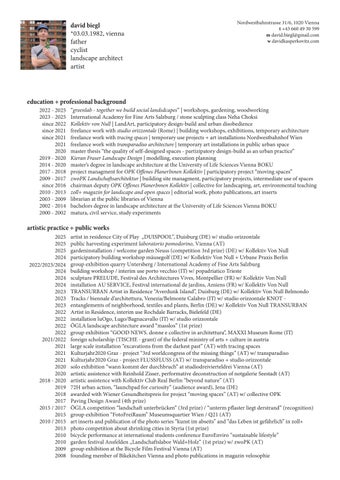 “greenlab - together we build social landsdcapes” | workshops, gardening, woodworking International Academy for Fine Arts Salzburg / stone sculpting class Neha Choksi Kollektiv von Null | LandArt, participatory design-build and urban disobedience freelance work with studio orizzontale (Rome) | building workshops, exhibitions, temporary architecture freelance work with tracing spaces | temporary use projects + art installations Nordwestbahnhof Wien freelance work with transparadiso architecture | temporary art installations in public urban space master thesis “the quality of self-designed spaces - partizipatory design-build as an urban practice” Kieran Fraser Landscape Design | modelling, execution planning master’s degree in landscape architecture at the University of Life Sciences Vienna BOKU project managment for OPK Offenes PlanerInnen Kollektiv | participatory project “moving spaces” zwoPK Landschaftsarchitektur | building site managment, participatory projects, intermediate use of spaces chairman deputy OPK Offenes PlanerInnen Kollektiv | collective for landscaping, art, environmental teaching zoll+ magazin for landscape and open spaces | editorial work, photo publications, art inserts librarian at the public libraries of Vienna bachelors degree in landscape architecture at the University of Life Sciences Vienna BOKU matura, civil service, study experiments
