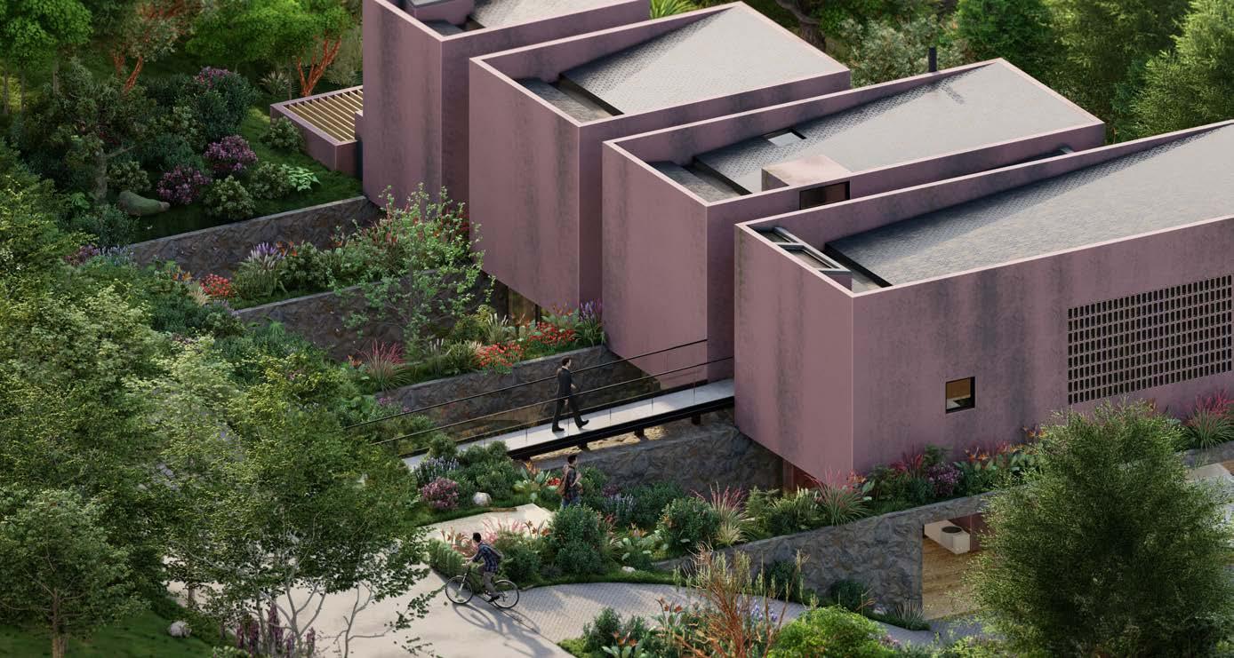 PIMG 1: Isométrico de la Casa Panorama, destacando su forma, adaptación al entorno y la integración de los espacios interiores con el paisaje exterior.