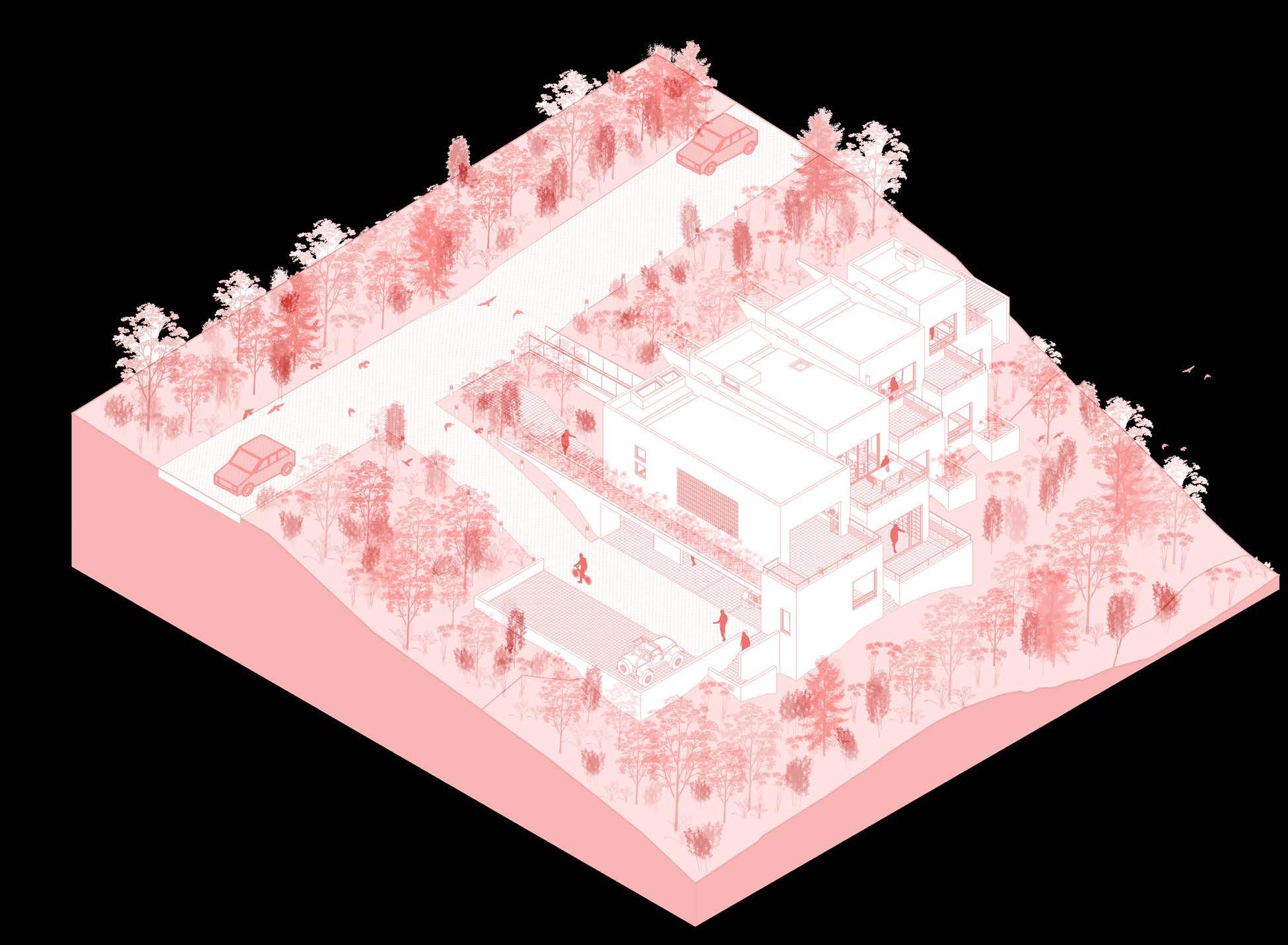 IMG 2: Isométrico seccionado de la Casa Horizonte, destacando los espacios interiores del proyecto y sus diversas funciones programáticas.