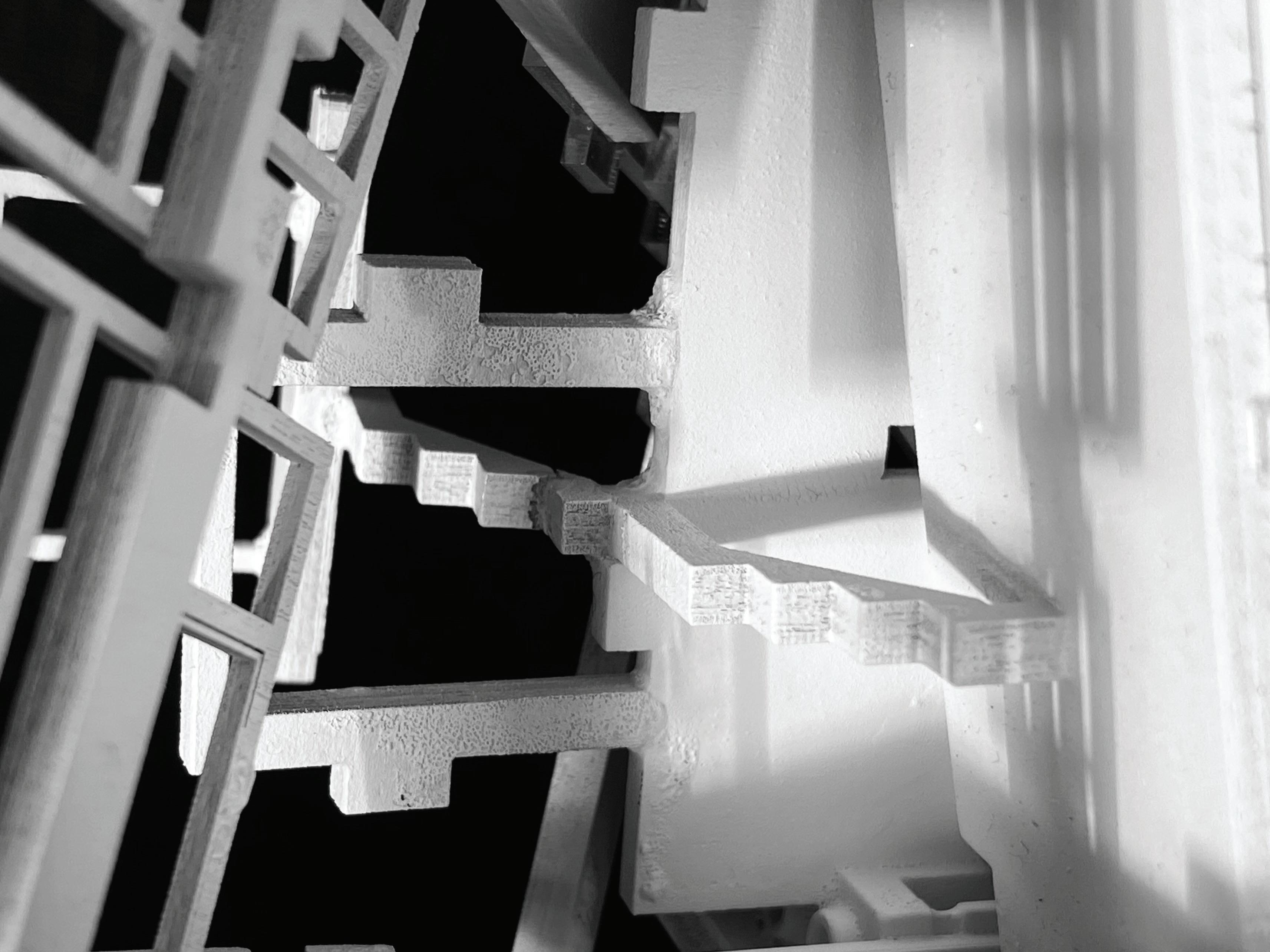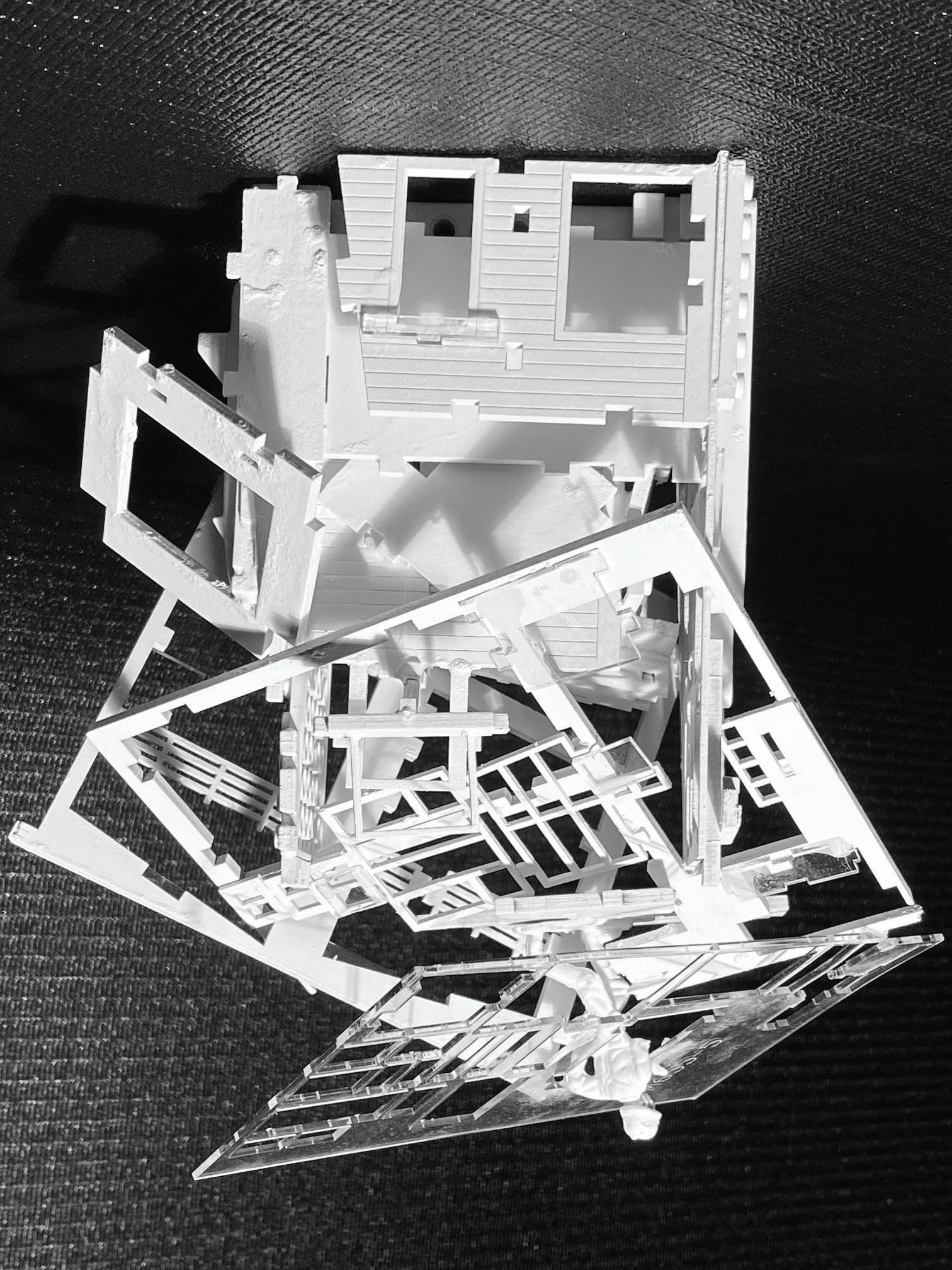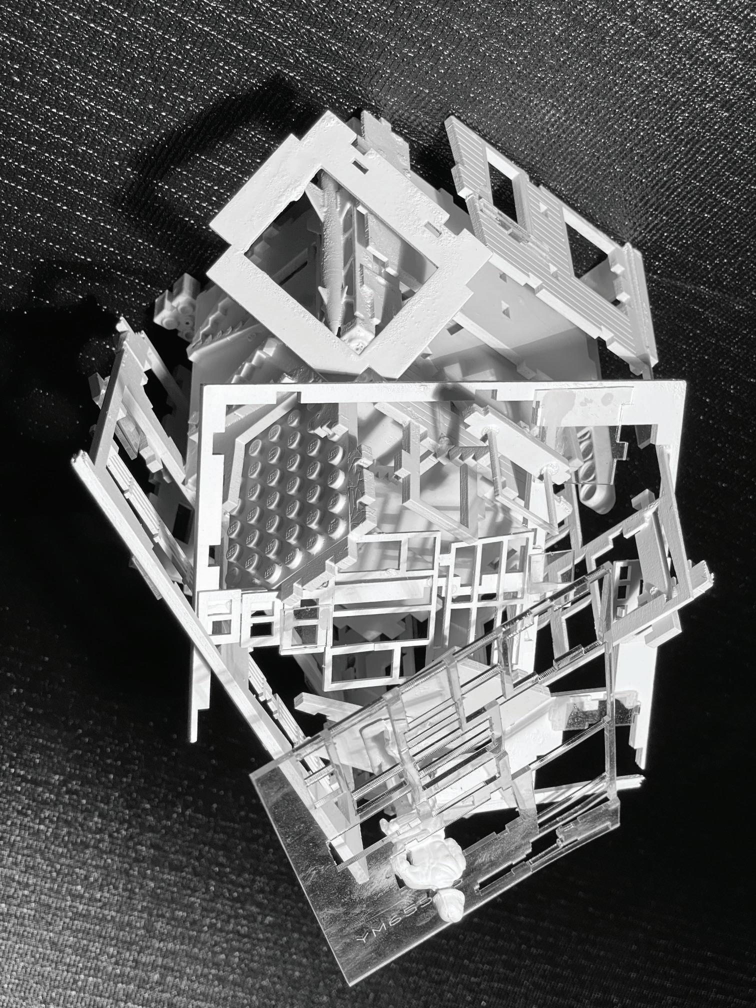 This project is an abstract experimentation centered around forms that wrap, intersect, and reflect. The forms were influenced by studies of walls and trails in the built world. In this design, trails intersect and wrap around the walls. Walls also wrap around and intersect other walls. These components are then reflected to create cube-like form. Through the process of wrap, intersect and reflect, this abstract cube provides phenominal views that invite your imagination to decide what it is. The physical model is composed of museum board and acrylic.