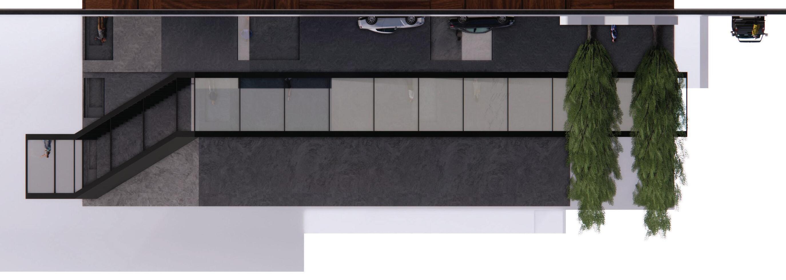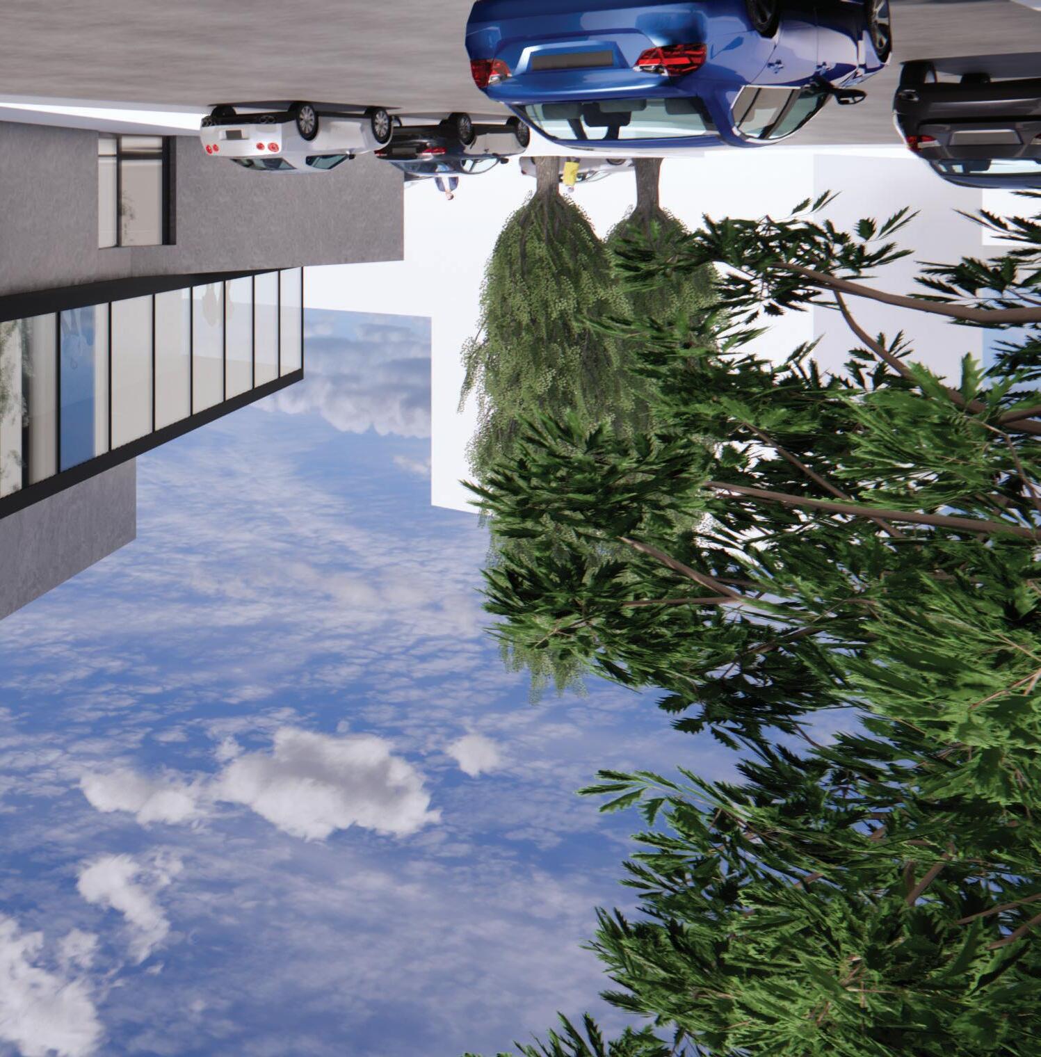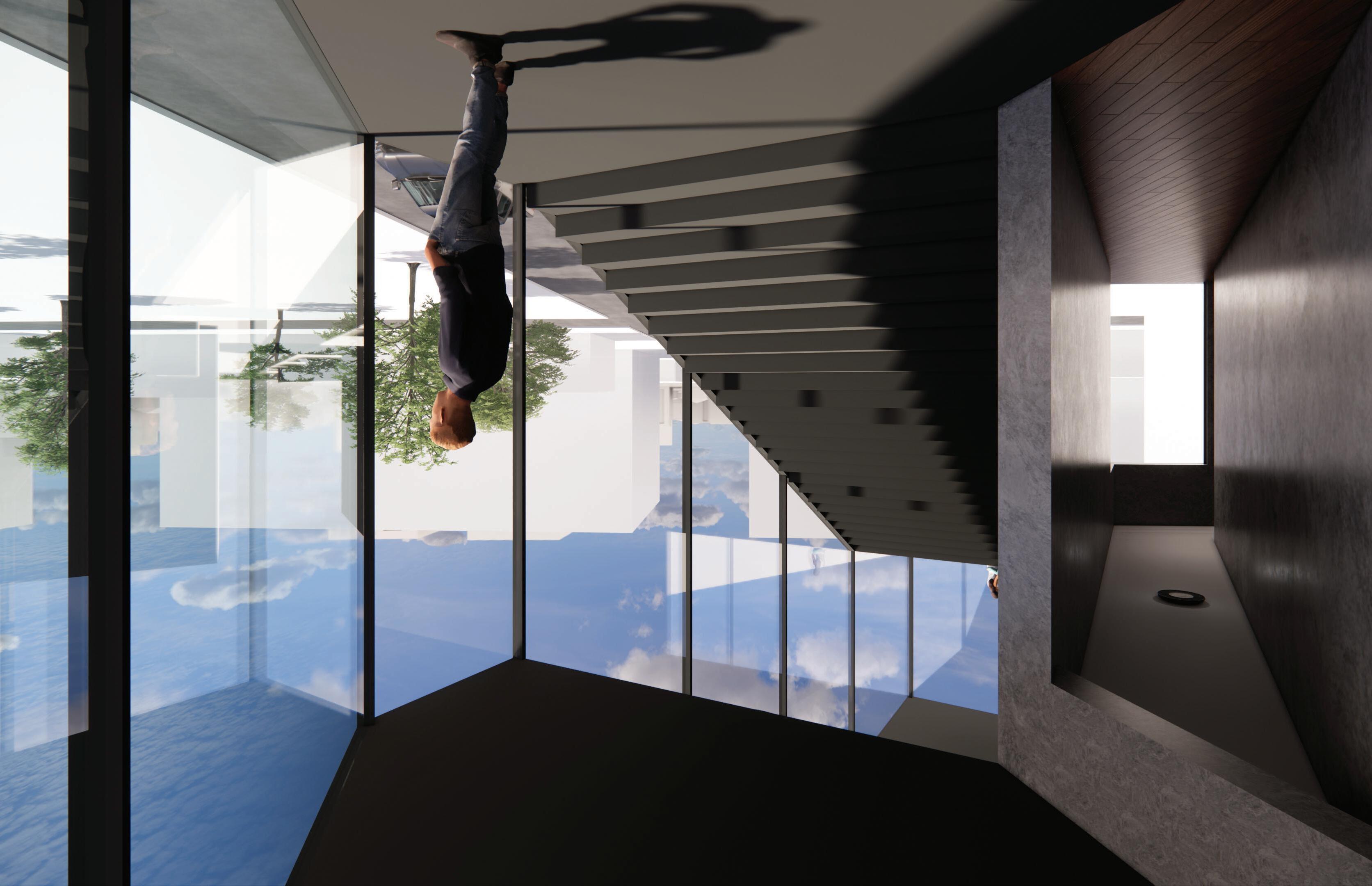 In order to leave Dallas and enter a national park, one must pass under the massive red arc and descend underneath the infinity-edge reflection pool that drowns out the city. Upon entering the building, you are met with a five-story lobby whose space is molded by concrete walls mimicking those of a canyon. Once you reach the third floor, you are faced with an unexpected and breathtaking view in the panoramic projection deck that is cantilevered over the reflection pool. Instead of seeing Clyde Warren Park and the Dallas skyline, the viewer is connected with a panoramic view of a national park landscape through the use of projection technologies and opaque smart glass.