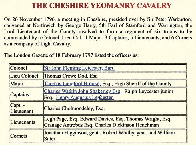 In 1796 Sir Peter Warburton of Arley in Cheshire presided over a meeting arranged in Northwich in ‘the interest of the inhabitants of the County of Chester’ and convened by the Lord Lieutenant, the 5th Earl of Stamford, ‘in order to receive offers of service from gentlemen willing to accept commissions in a body of Provisional Cavalry, to be raised in the county’. This was to comprise six Troops, to be commanded by a colonel, a lieutenant colonel, one major, three captains and six cornets.