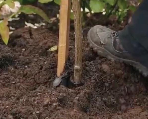 For a bare root rose, place the stake about 10cm (4”) from the hole’s centre, driving it into the soil with a mallet or hammer. Ensure the top of the stake is level with where the trunk splits into branches.