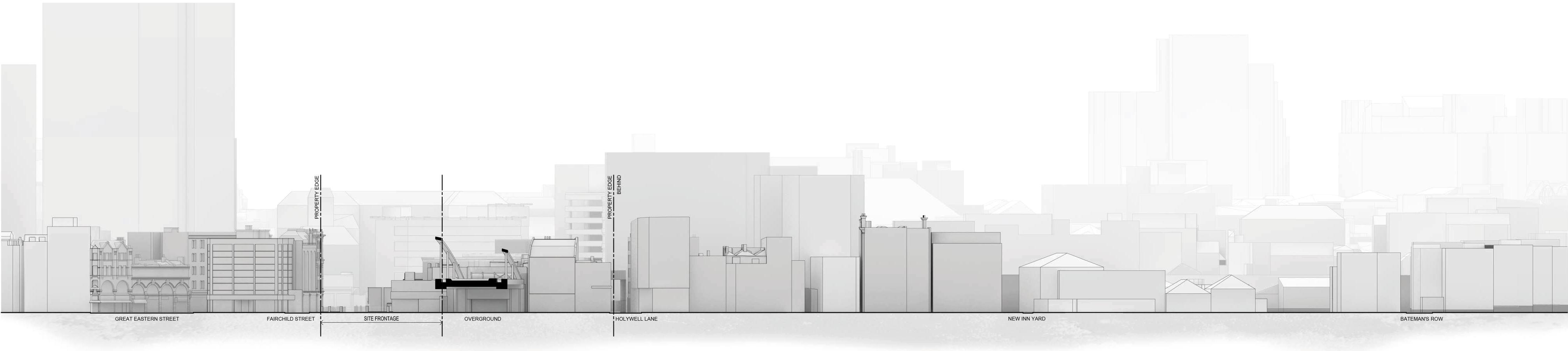 The site is located at 201-207 Shoreditch High Street and 1 Fairchild Street and is bound by Holywell Lane to the north. The route of the London Overground railway contains the site to the north, elevated on a viaduct approximately 7 metres above street level.