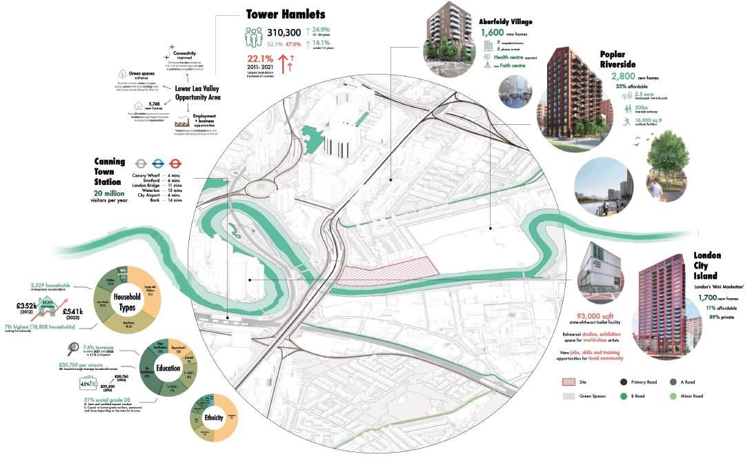 The zoning of the site connects the site with the surrounding community through the accessible green spaces and a dynamic riverfront walkway. The landscaped green spaces weave through the residential buildings with a central park where community events and gatherings could take place. Vehicle access is positioned along the rear of the site where the shadows are cast from the neighbouring building. Access to the site is solely through Lanrick Road which connects to East India Dock Road via a sharp turn, making access for larger construction vehicles difficult. Therefore, the river could be used as a means of transport materials and machinery to the site using barges.