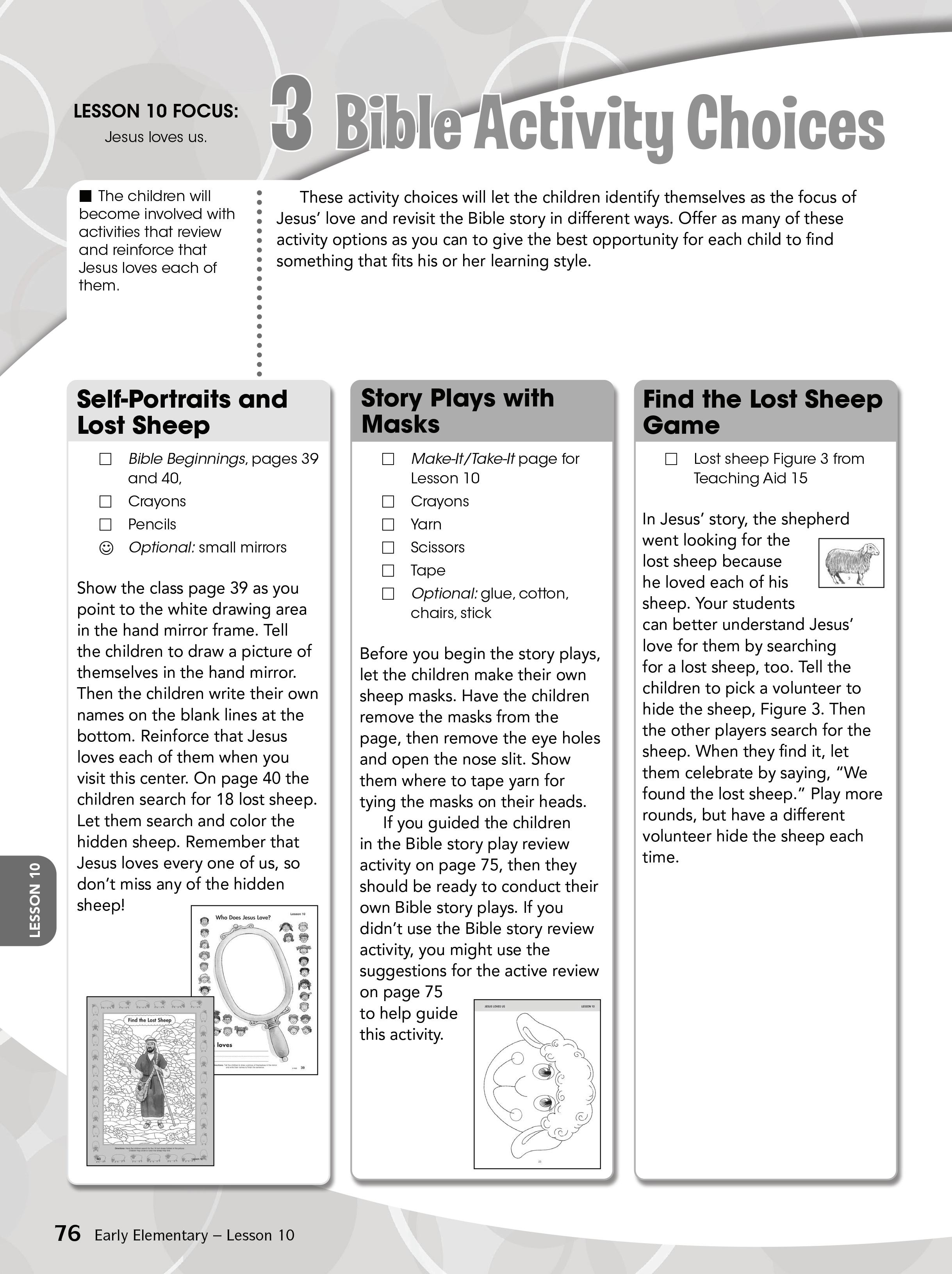 3. Bible Activity Choices encourages children to review the Bible lesson with activities tailored to different learning style.