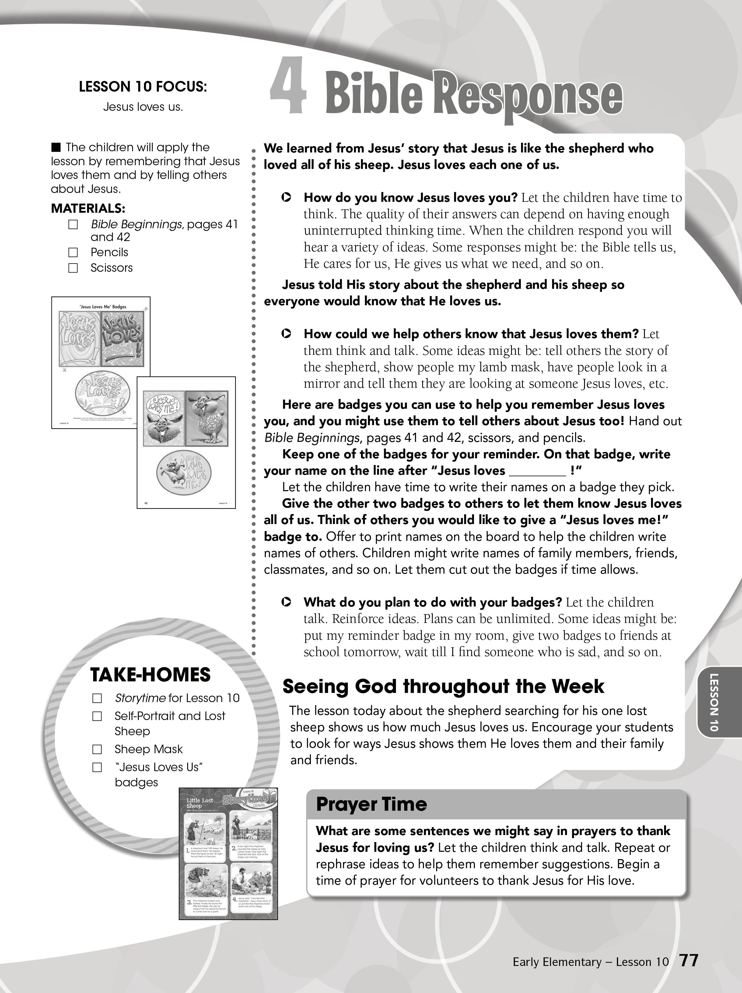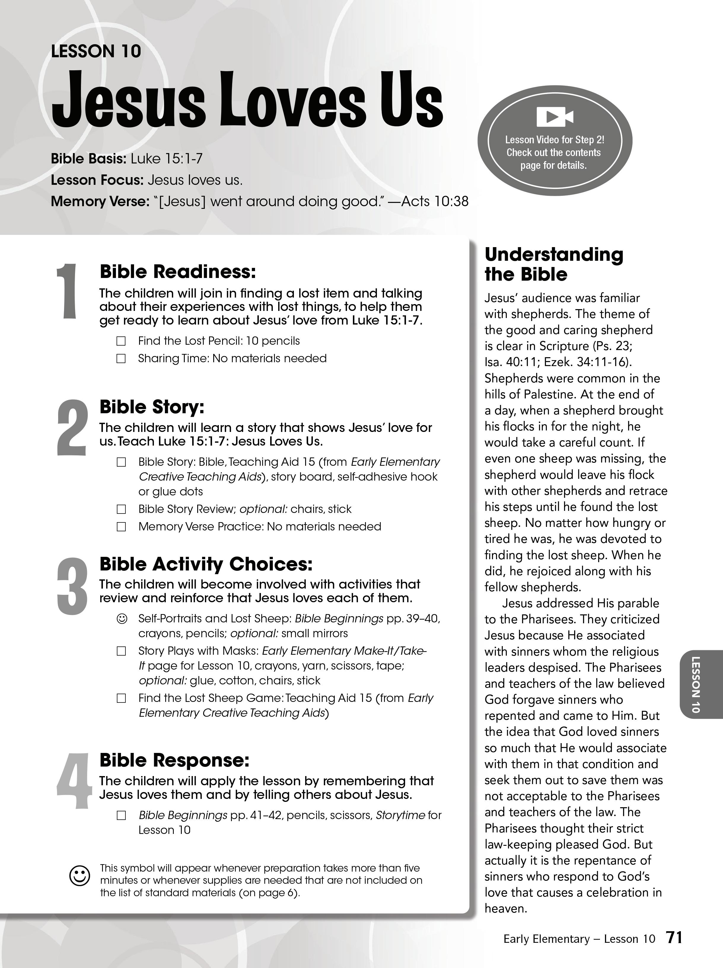 In every lesson, you’ll find a teacher devotional, Bible background information, tips on understanding and teaching specific age levels, and the Bible story along with a variety of activities to help students learn and apply the Bible lesson.