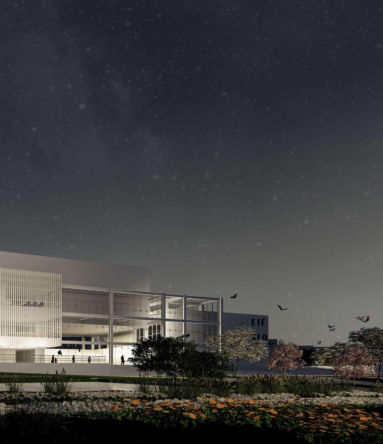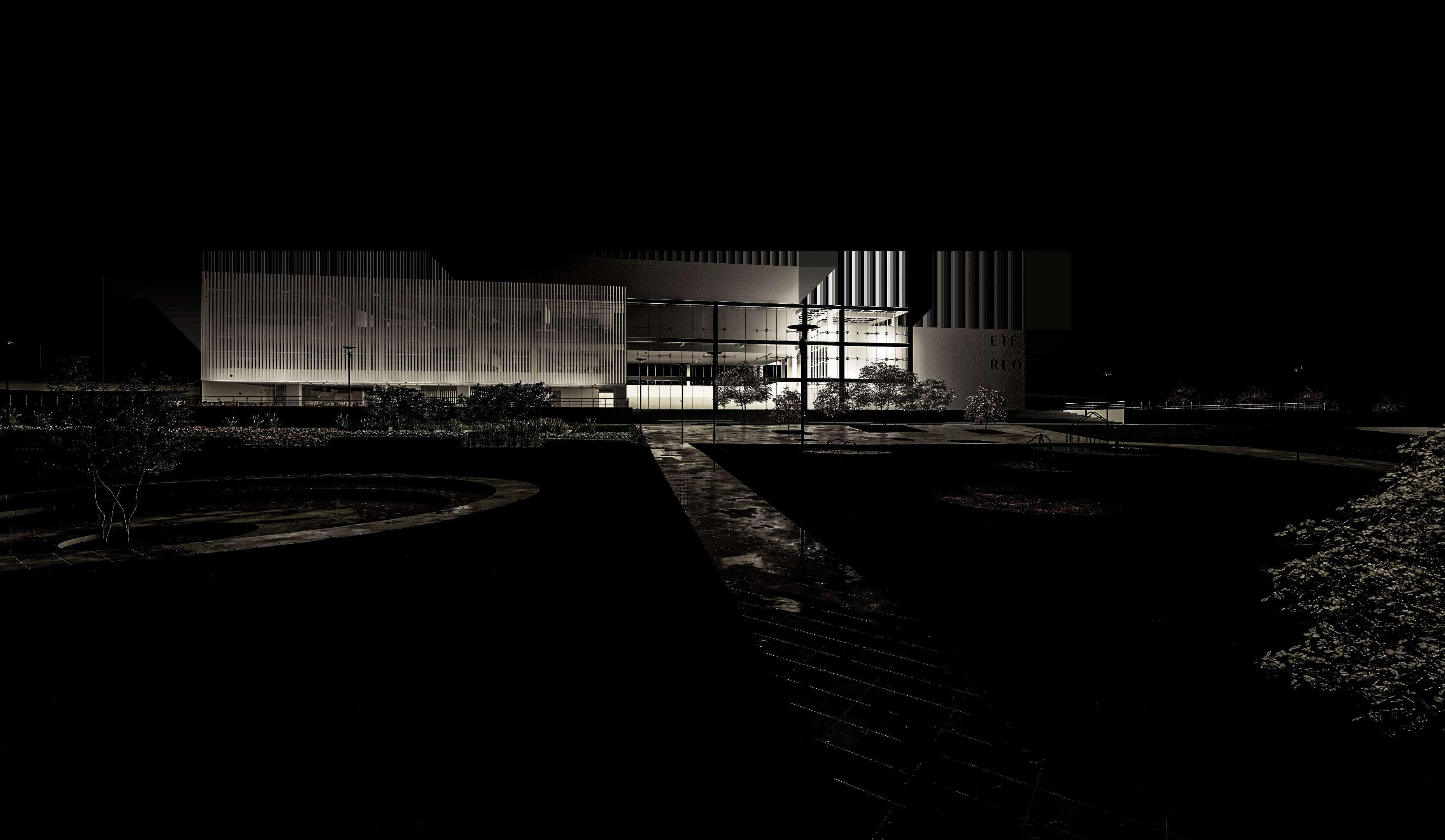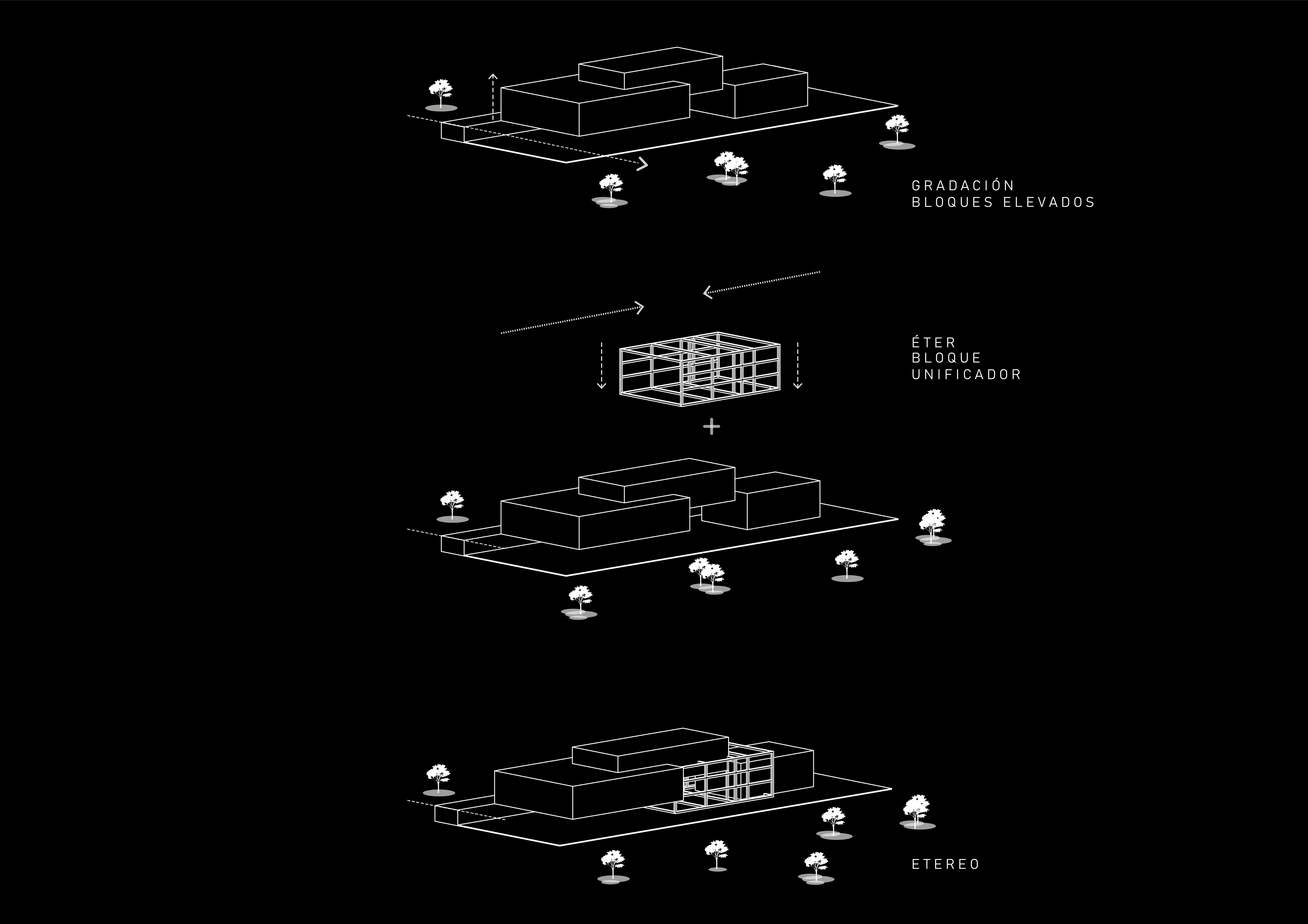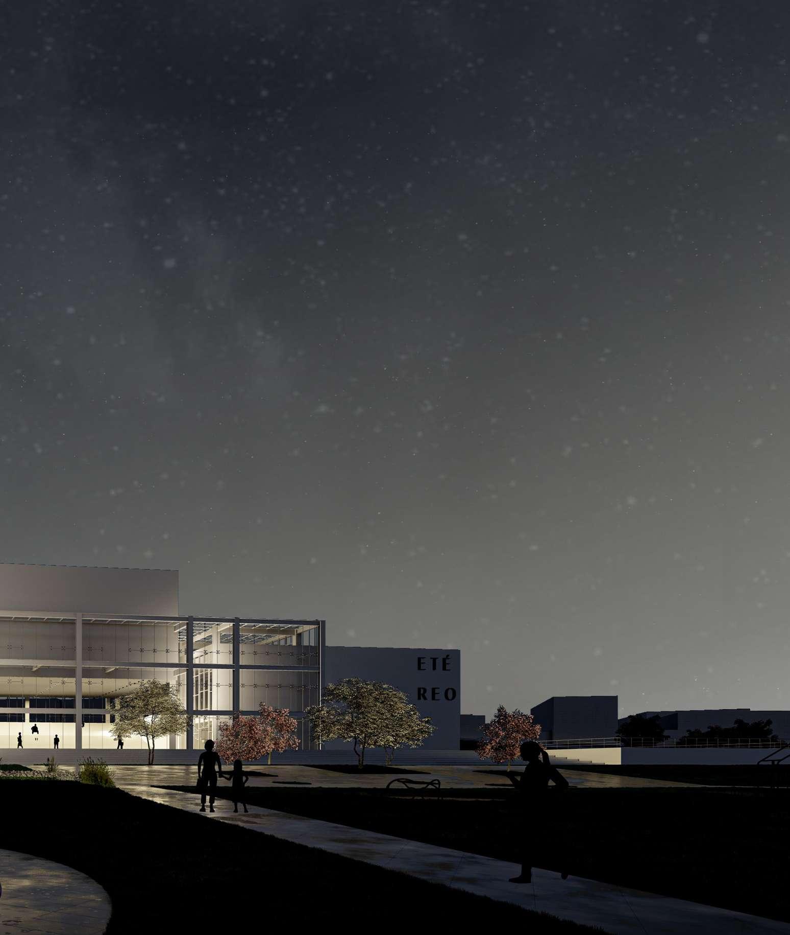 E téreo es una composición estereotómica de volúmenes dispuestos a diferentes alturas, relacionados por un concepto de vacío unificador, el cual se convierte en el éther del objeto arquitectónico, el origen. La dicotomía estructural del hormigón y el metal se debe a un proceso de adapatación el edificio a varias funciónes.