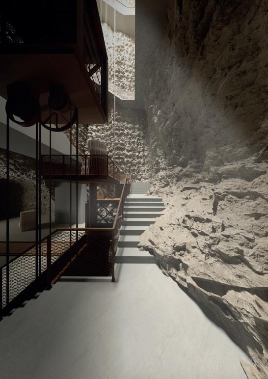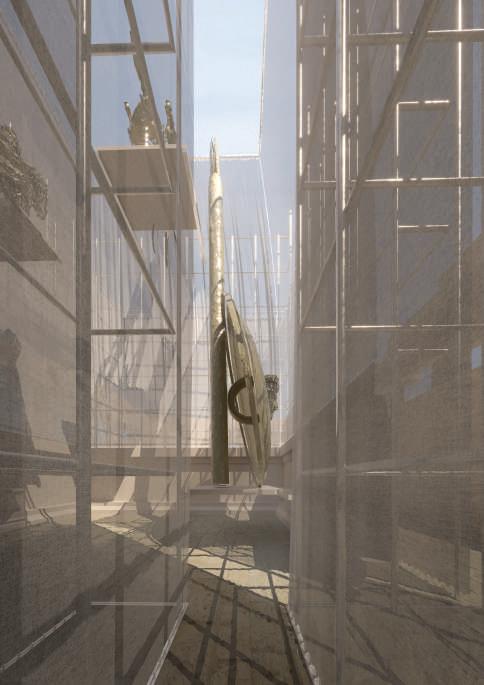 On the slopes of the Acropolis, the most substantial storage and site space is developed, in a new building on the Odeon site. This choice has a twofold significance: functional, given its gigantic footprint, which makes it possible to occupy a vast area for storage, and symbolic, because the Odeon was built as a support structure for the nearby theatre of Dionysus. The Factory dimension also reverberates in the material choice of the proposed volume, which attempts a relationship with the context in which it is inserted. Materials and workers continue their ascending path to the Acropolis through the Aglaurus Cave. Through a central spine, or catwalk, that runs entirely through the space created in the hypogeum, materials and workers culminate their journey in large workshops created orthogonally to the spine.