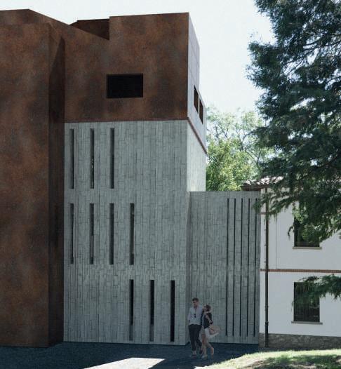 On the north elevation there is a body which unifies the accesses to the different functions of the castle. This volume ends on one side with the slope of the existing building and on the other with a small terrace serving the library.