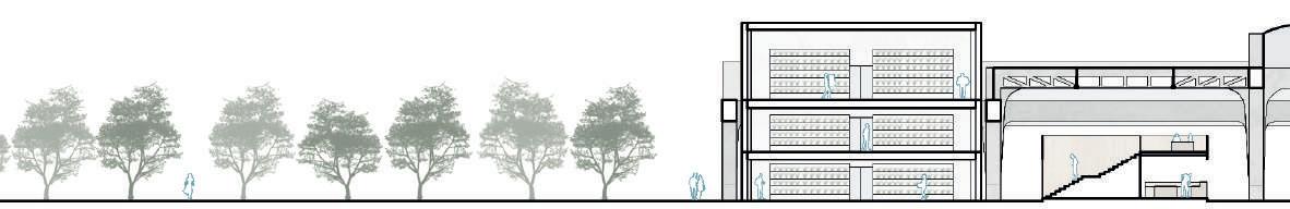 The central strip is characterised by a large covered public space, where, in addition to the west-east axis, there are activities for the sale of food produced in the neighbouring spaces.