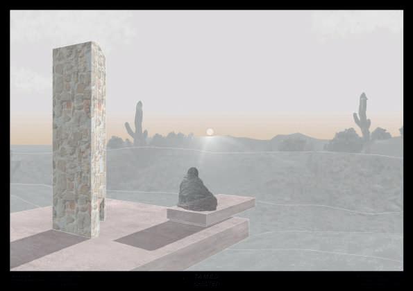 Tamed Shelter is a project in the Sonora Desert, north of Taliesin West. It is located near many other shelter projects, along one of the main paths connecting with the university. The design intention is to tame a vast and undefined space like the desert through the use of 3 archetypes.