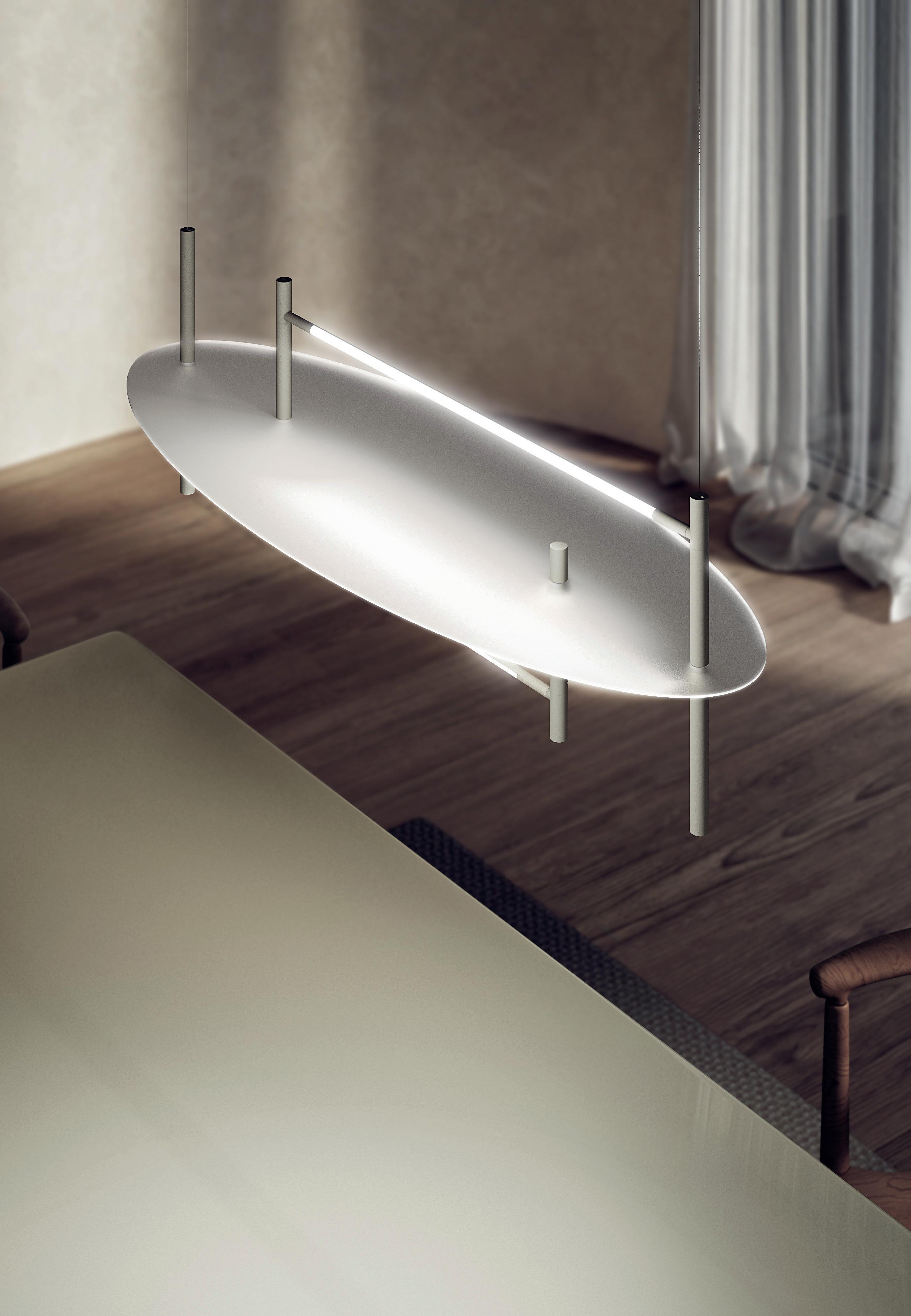Oì•Oval fasst Ästhetik und Funktionalität zusammen und erschafft elegante und vielseitige Beleuchtung. Die Philosophie Hu.li bleibt auch bei dieser neuen Hängeleuchte der rote Faden. Zwei leuchtenden Stiele Durchmesser 1 cm, dimmbar und frei verstellbar. Die zentrale Metallscheibe ermöglicht eine direkte, indirekte oder kombinierte Lichtnutzung.