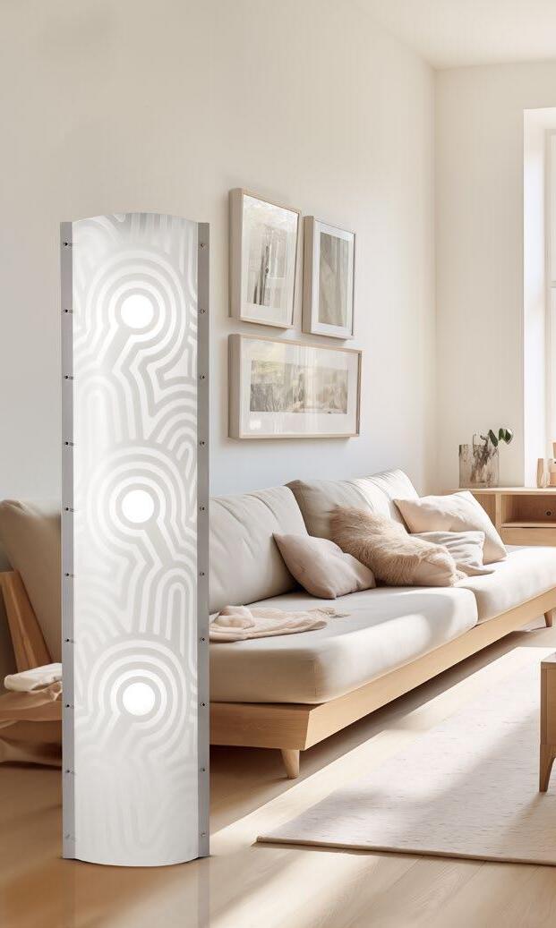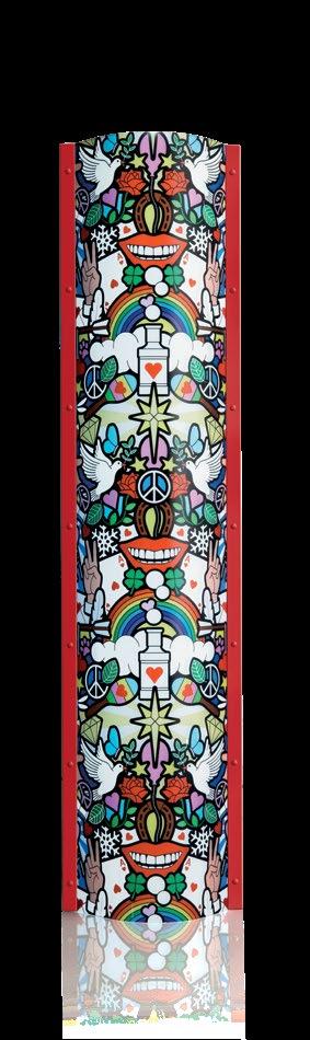 Scultura luminosa composta da un elemento centrale in metacrilato di 180 cm (70”) o 220 cm (86”), illuminata in modo uniforme.