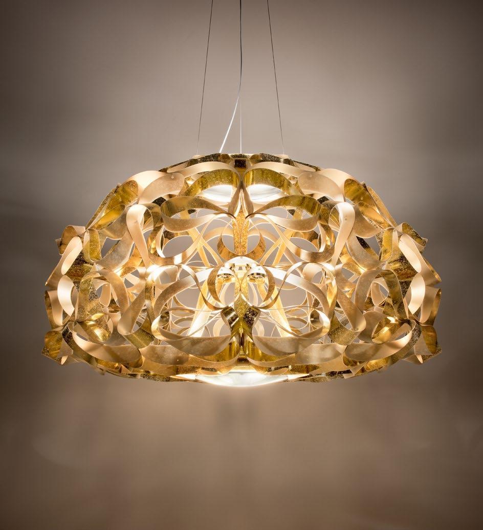 Gold has Cristalflex® arms metallized in a hyperbaric chamber; each piece is cut numerically, wrapped, and placed within the shipping box. Clients can rapidly and intuitively assemble the lamp.