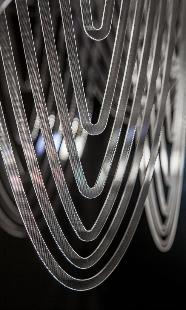 La scultura luminosa è composta da un corpo illuminante modulare che crea onde sinusoidali nello spazio, avvolta da layer in policarbonato tutti diversi fra loro.
