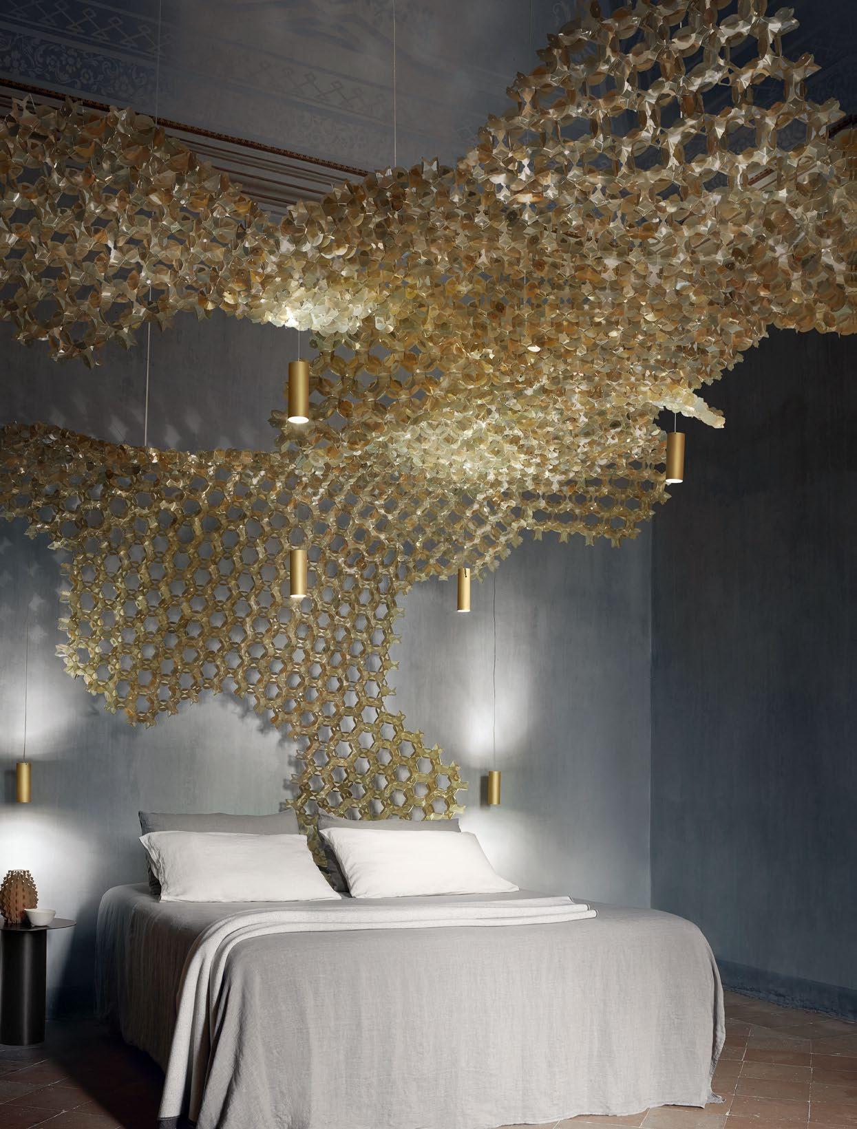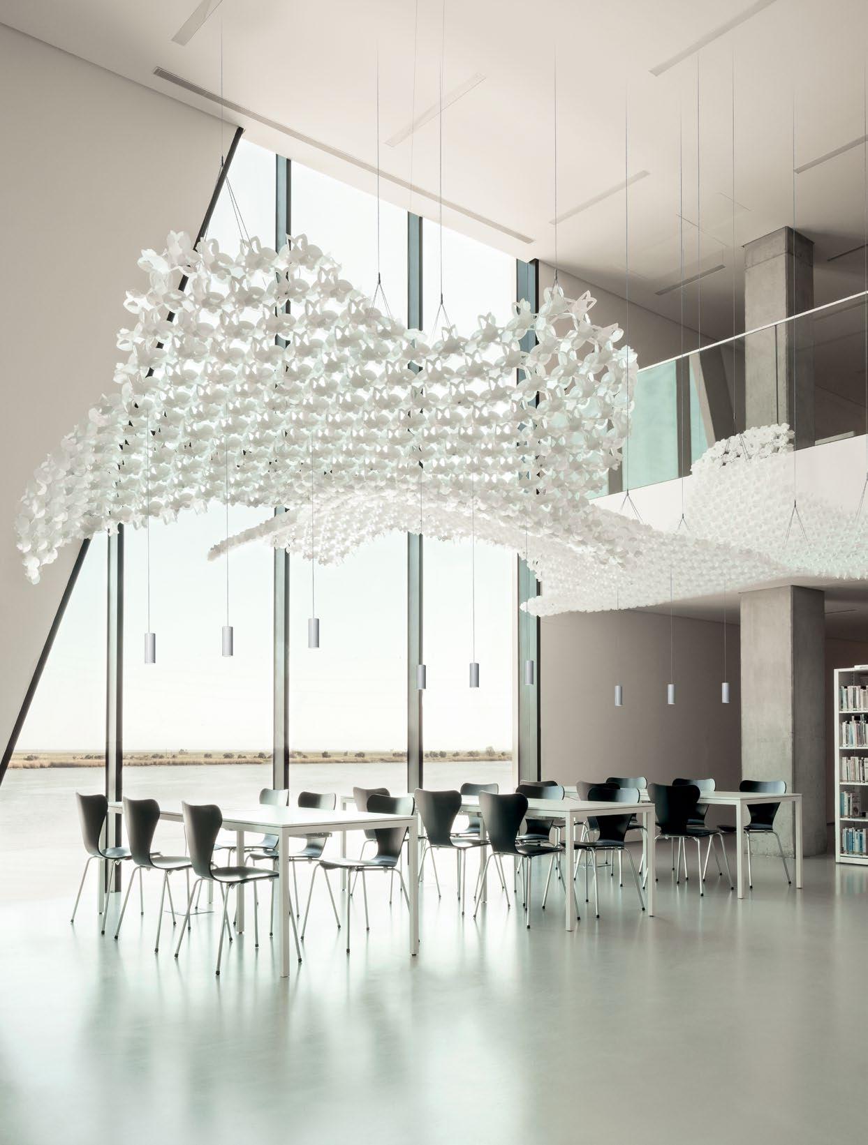 Nuvem va oltre la semplice illuminazione tradizionale: l’agilità della sua anatomia le permette di enfatizzare gli elementi architettonici trasformandosi da “soffitto” a decoro, calando sulle pareti per eliminare ogni confine tra cielo e terra della stanza.