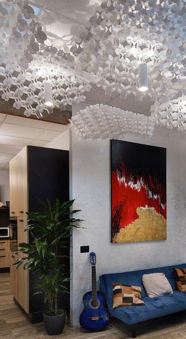 Il sistema di ancoraggio al muro grazie all’utilizzo degli accessori “distanziatori” offre al progettista libertà nella creazione di superfici decorative Nuvem. Fissando i moduli a diverse distanze dalla parete, permette di giocare con la profondità e il movimento della composizione.