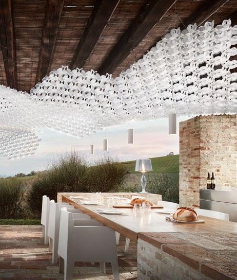 Nuvem Outdoor è una decorazione parietale, un’edera tecnologica, un sistema ombreggiante, un sistema luminoso impermeabile, qualcosa che prima non c’era e che non è mai uguale.