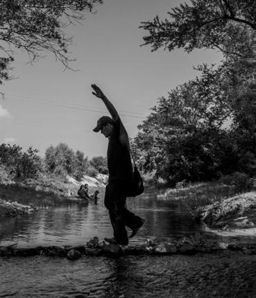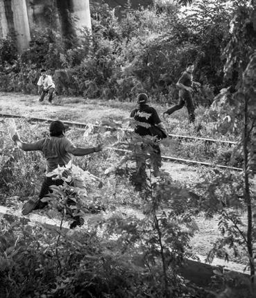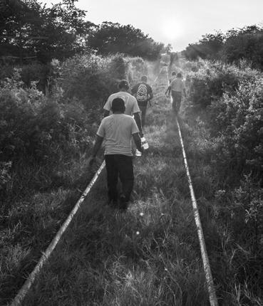Photograph by Daniel Berehulak for The New York Times, documenting a group of displaced individuals walking along railroad tracks north through Mexico. Fig. 21.