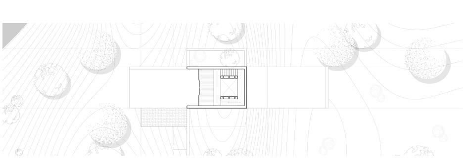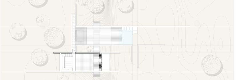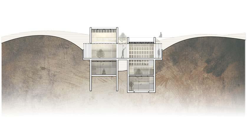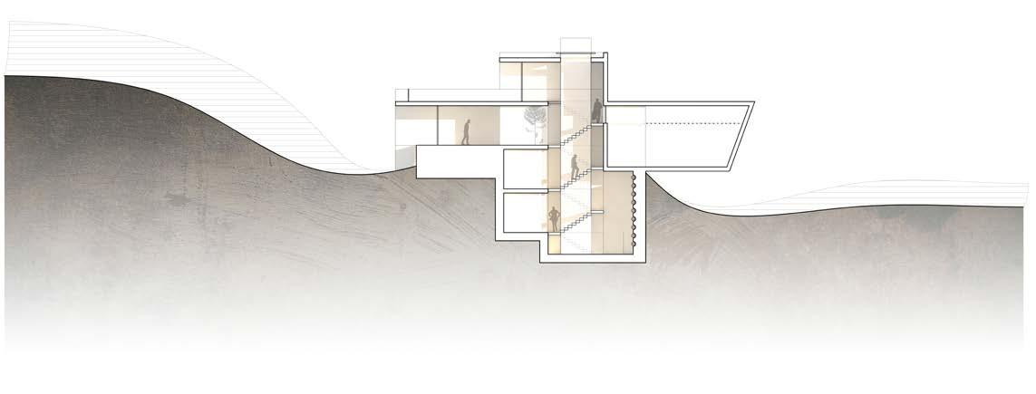 Longitudinal section, portraying the progression from entering the rooted structure, guided by existing trails within nature.