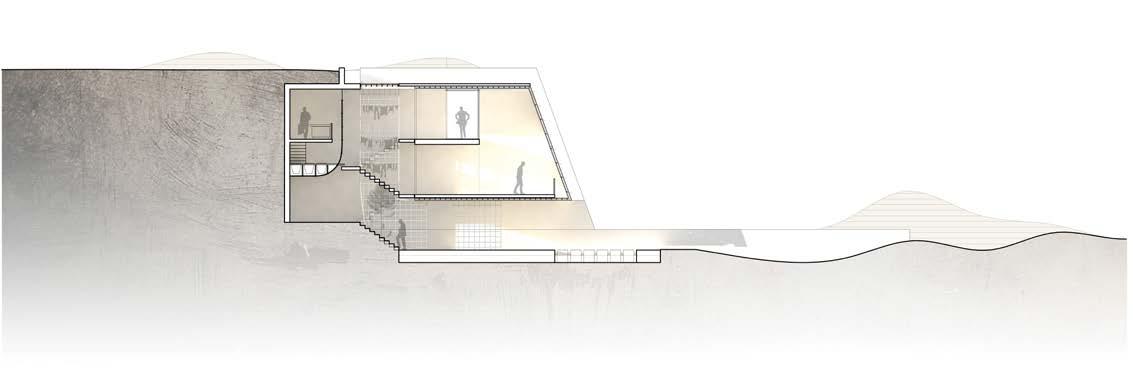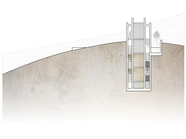 Longitudinal section, portraying the progression from entering the lightweight beacon, and experiencing the varied spaces surrounding the vertical structure.