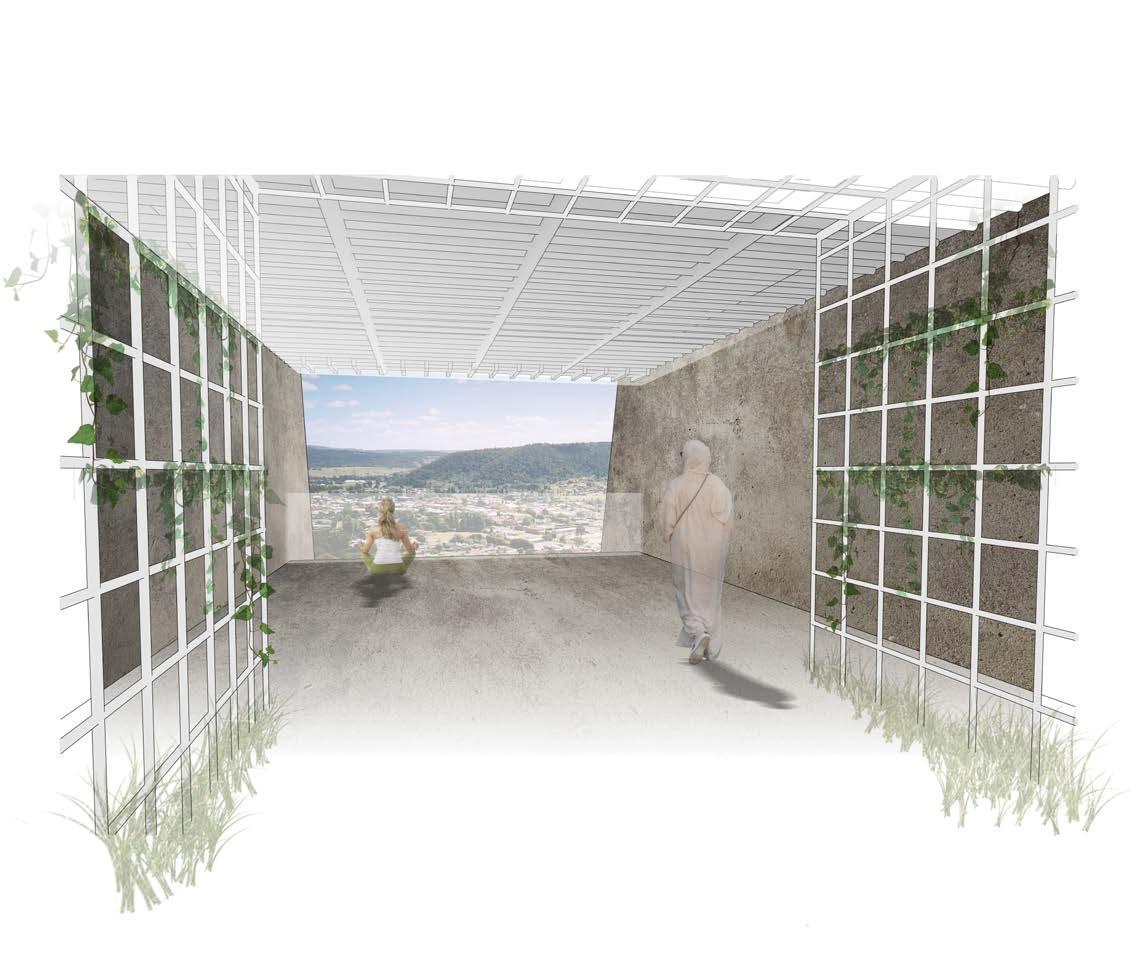Interior perspectival rendering, portraying the space of meditation where the visual connection between the construct and the city of Lithgow, Australia is framed to generate a sense of belonging. The breeze would cool the interior of the construct, allowing the spaces to breathe in the warm climate.