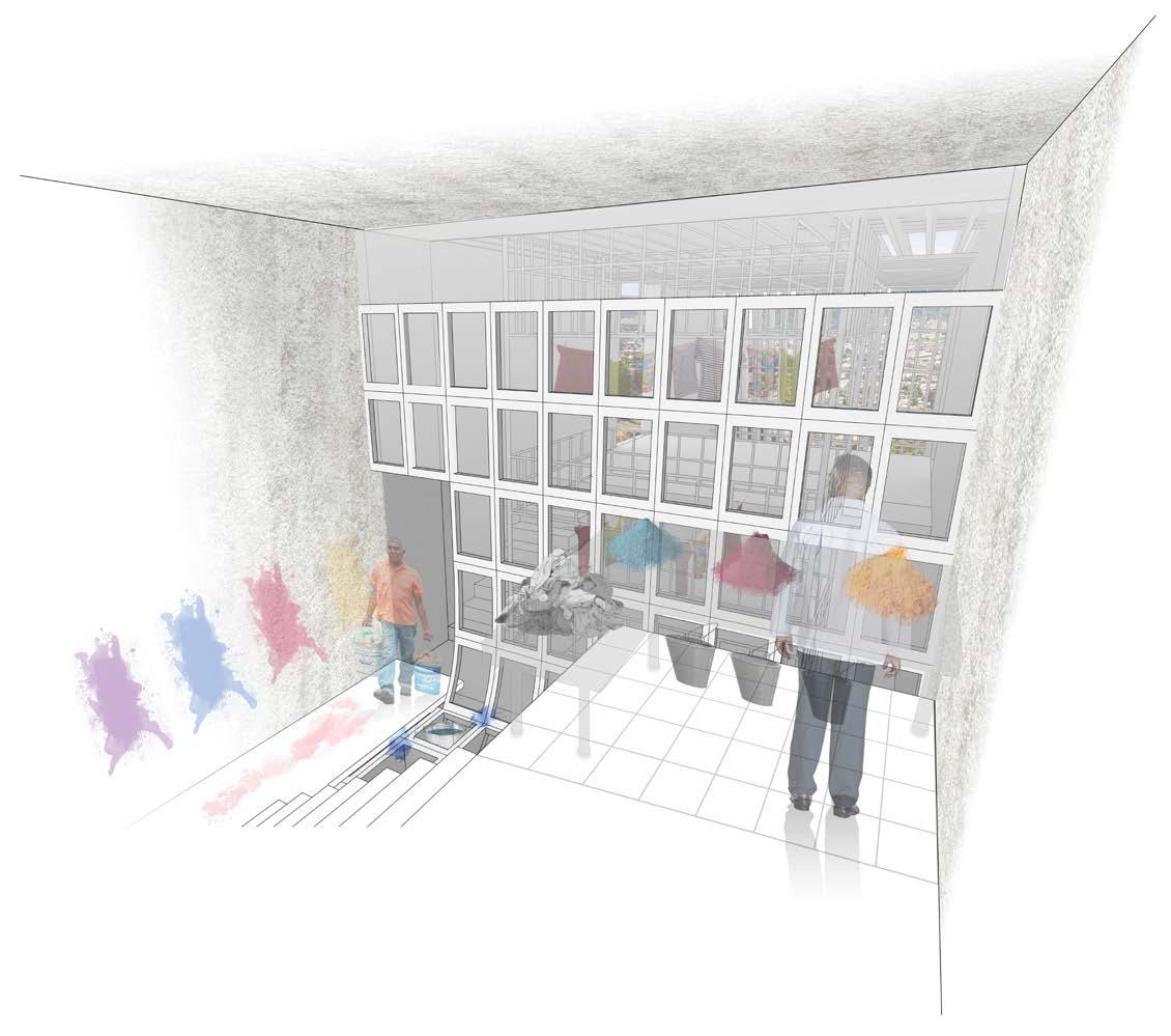 Interior perspectival rendering, portraying the space of dyeing, a space within a space elevated on the backside of the construct. This space takes advantage of its isolated qualities by acting as a white canvas to dye clothes. The adjacent wind funnel works in conjunction by allowing the hanging of attire for drying.
