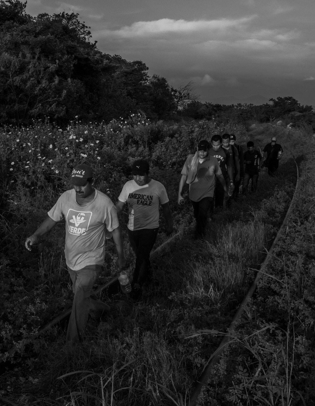 Photograph by Daniel Berehulak for The New York Times, documenting a group of displaced individuals walking along railroad tracks north through Mexico.