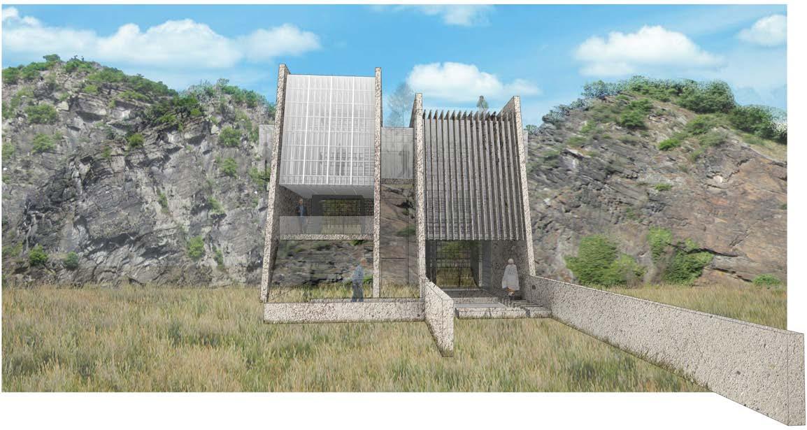 Exterior perspectival rendering of the warm interval haven, located in Lithgow, Australia.