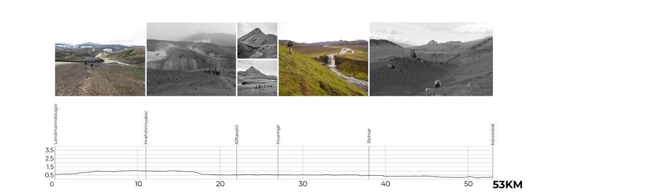Elevation profile analysis of Laugavegur in Iceland, showcasing the various unique landscapes across the 53km trail, and locating the rest huts along the way.