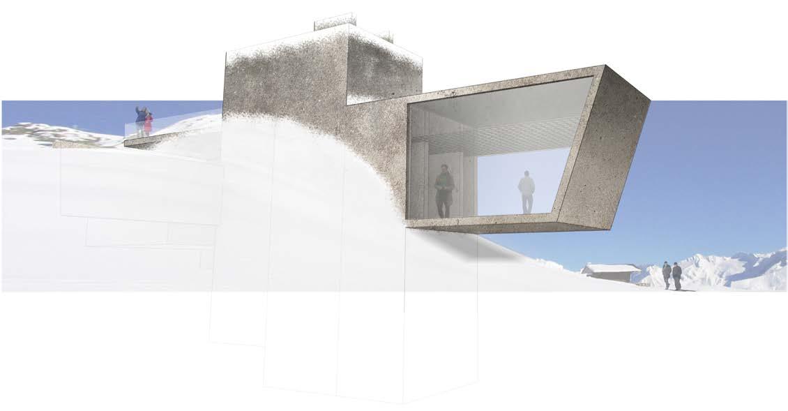 Exterior perspectival rendering of the cold interval haven, located in Siglufjörður, Iceland.