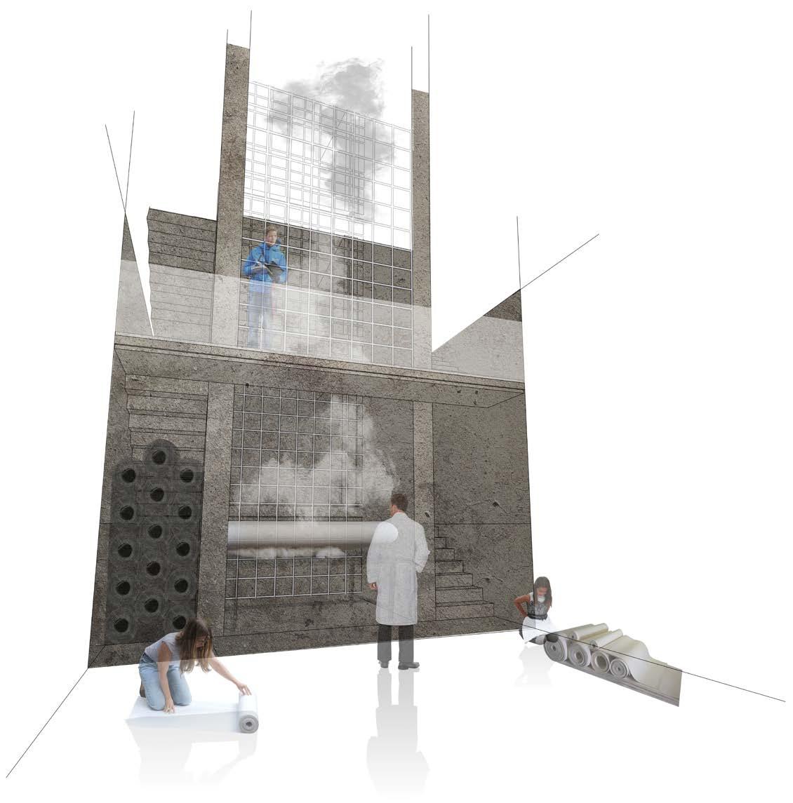 Interior perspectival rendering, portraying the space of felting at the lowest level of the structure, taking advantage of the cleaving gesture of the construct and utilizing the funnel to heat the spaces within the construct.
