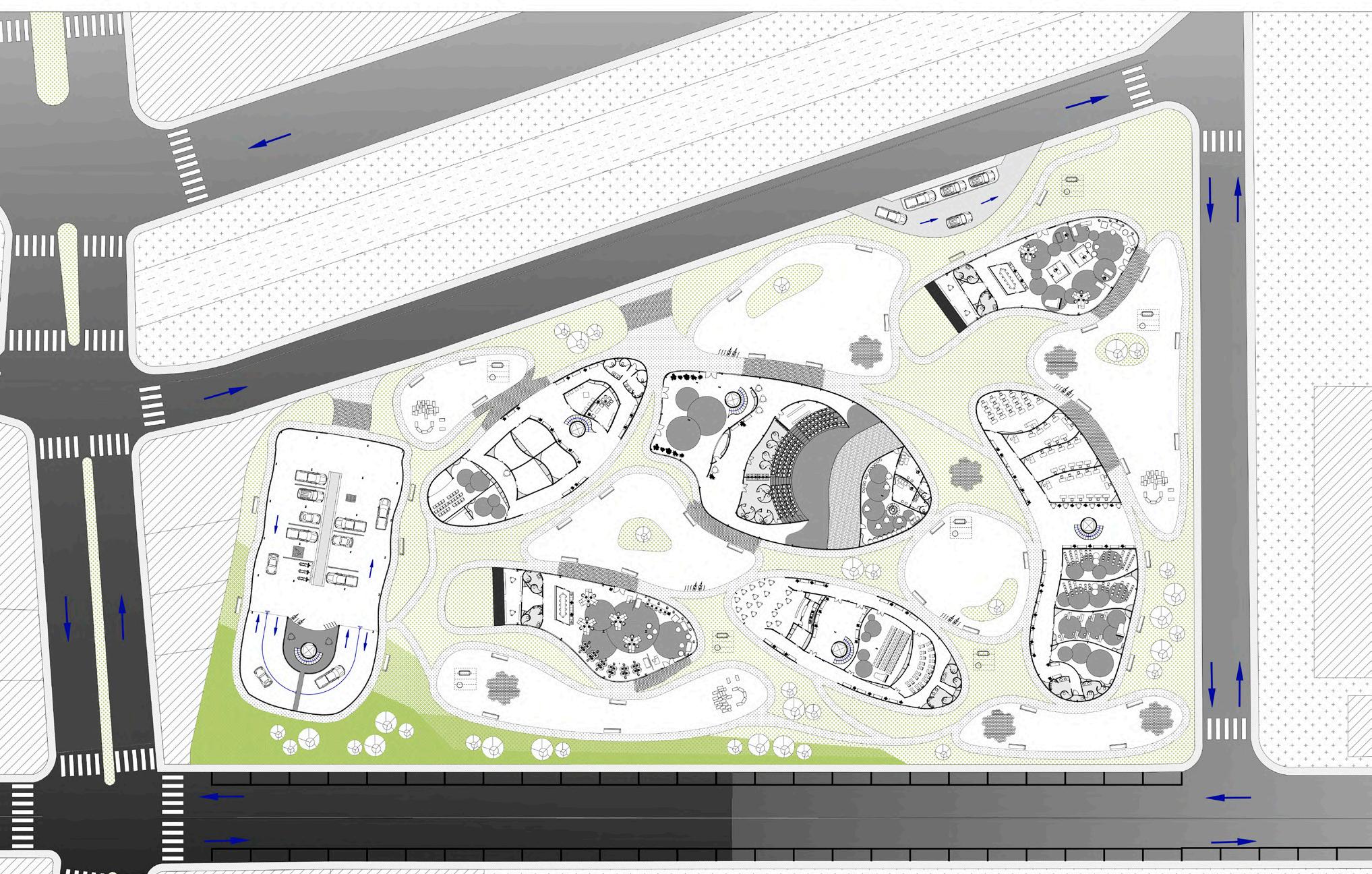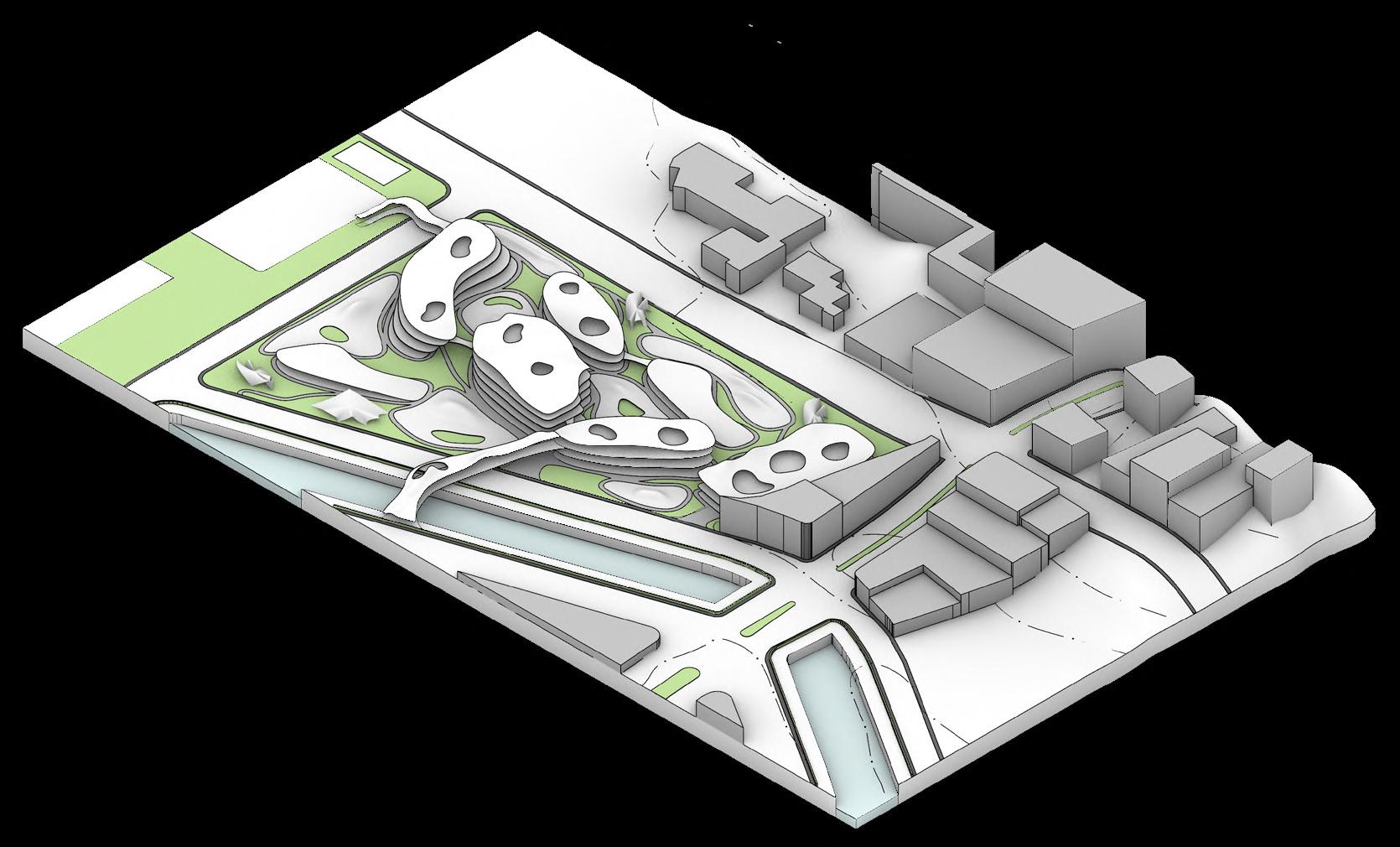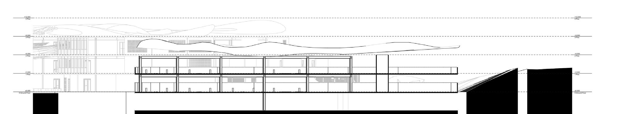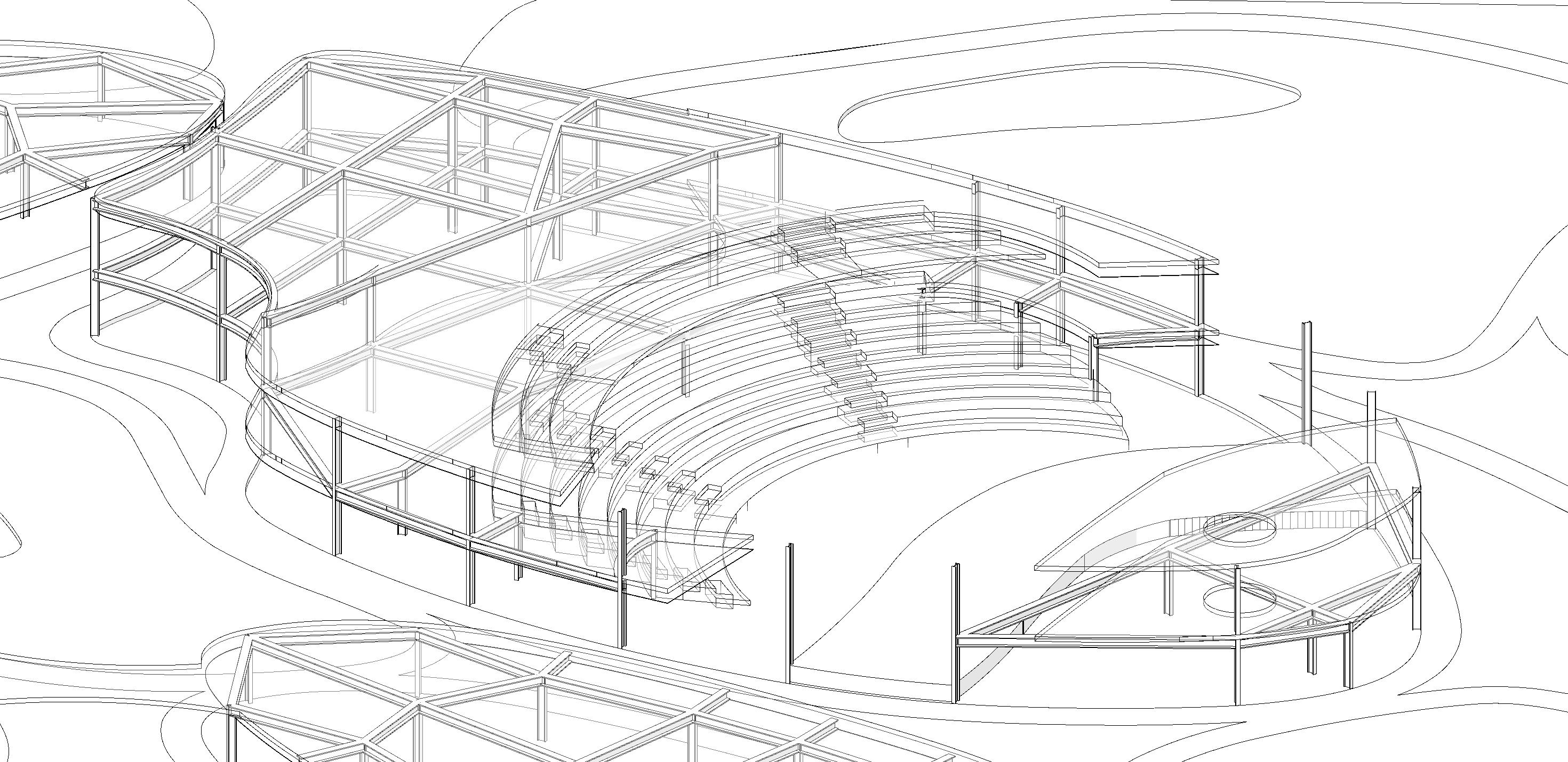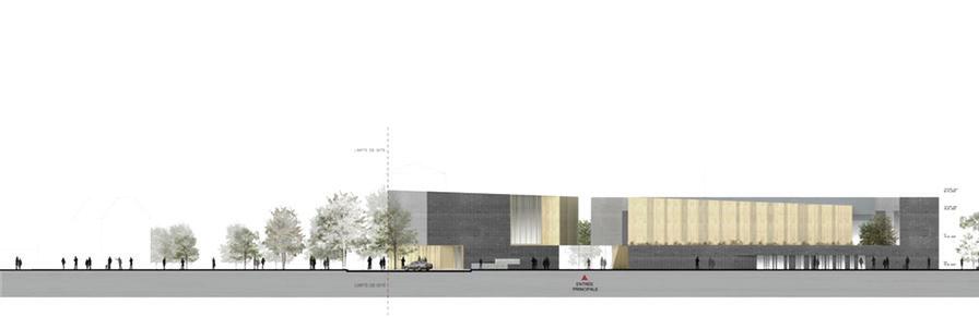 Todo el programa se desarrolla en varios equipamientos dando flexibildad al lugar, existen formas oblicuas dentro del proyecto que contrastan con lamas exteriores que permiten generar ligerza exterior volviendolo un proyecto único.