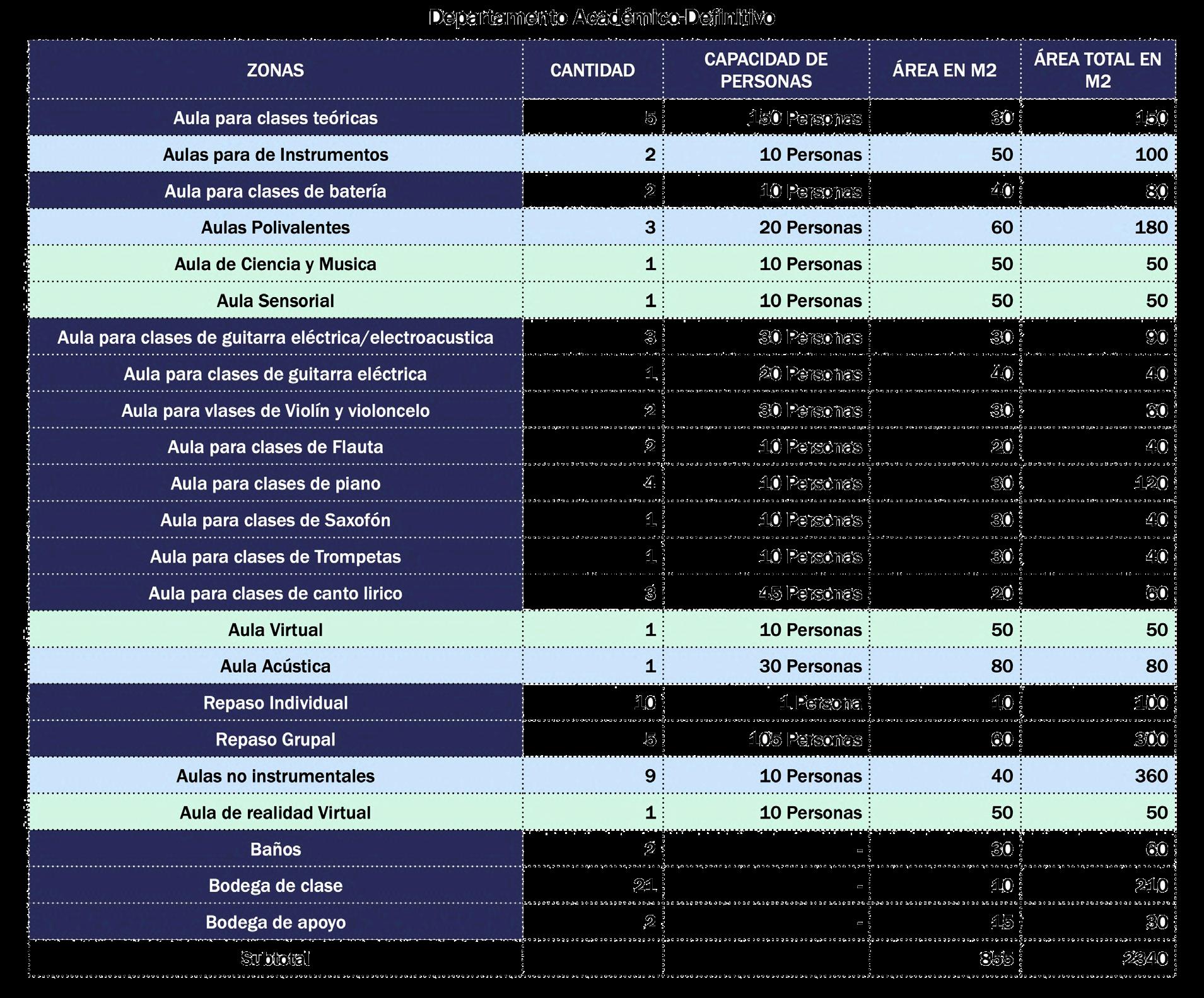 Los espacios diseñados para educación estan adecuados a los planteados en el programa, entonces se creo espacios diferentes dependiendo del instrumento, así mismo, las aulas varian dependiendo de la clase que se imparta existiendo un gran número de zonas diferentes donde al eduación es más proactiva logrando que la educación sea mejor, por ejemplo las aulas de experimentación donde existen individuales y grupales, en el caso de las individuales permitiendo que el profesor se centre