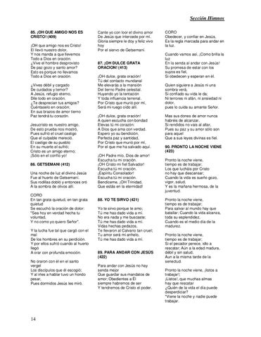 Sección Himnos 85. ¡OH QUE AMIGO NOS ES CRISTO! (409) ¡OH que amigo nos es Cristo! El llevó nuestro dolor, Y nos manda a que llevemos Todo a Dios en oración. ¿Vive el hombre desprovisto De paz gozo y santo amor? Esto es porque no llevamos Todo a Dios en oración. ¿Vives débil y cargado De cuidados y temor? A Jesús, refugio eterno, Dile todo en oración. ¿Te desprecian tus amigos? Cuéntaselo en oración; En sus brazos de amor tierno Paz tendrá tu corazón. Jesucristo es nuestro amigo, De esto prueba nos mostró, Pues sufrió el cruel castigo Que el culpable mereció. El castigo de su pueblo En su muerte el sufrió; Cristo es un amigo eterno; ¡Sólo en el confío yo! 86. GETSEMANI (412) Una noche de luz el divino Jesús Fue al huerto de Getsemaní. Sus rodillas dobló y entonces oró A la sombra de olivos allí. CORO En tan grata quietud, en tan grata quietud Se escuchó la oración de dolor: "Sea hoy en verdad hecha tu voluntad, Y no como yo quiero Señor". Y la lucha fue tal que cargó con el mal De los hombres en su perdición. Y por ellos sufrió cuando al huerto llegó A orar con profunda emoción. No oraron con él en el santo vergel Los discípulos que él escogió; Y al irles a hablar tuvo un hondo pesar, Pues dormidos Jesús les miró.
