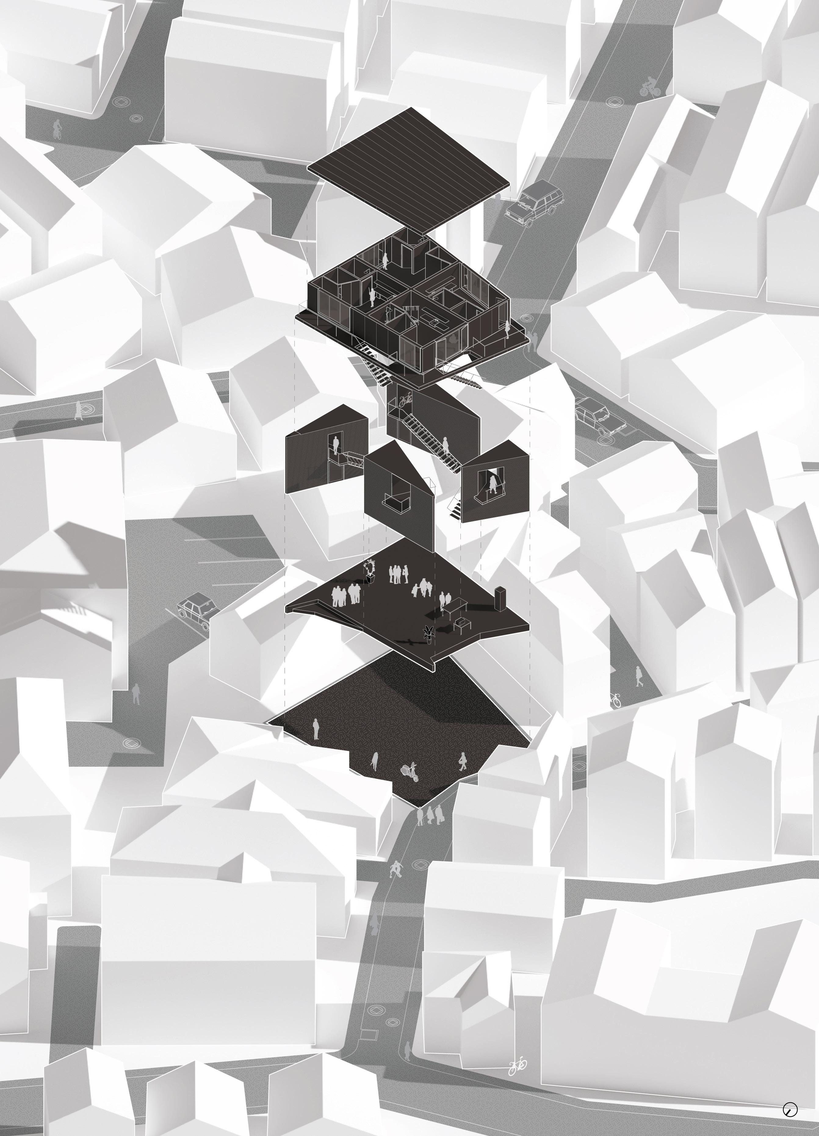 Located on a tiny lot in the noisy Toronto neighbourhood of Kensington Market, Opera House is a home for two musicians. The residential portion of the home floats above the street while a small, public concert hall in the basement anchors the home. Kensington Market is a polyphonic landscape; a landscape that has many voices which overlap and, in many ways, compete with one another. The design of Opera House is based off of an analytical study of its en -