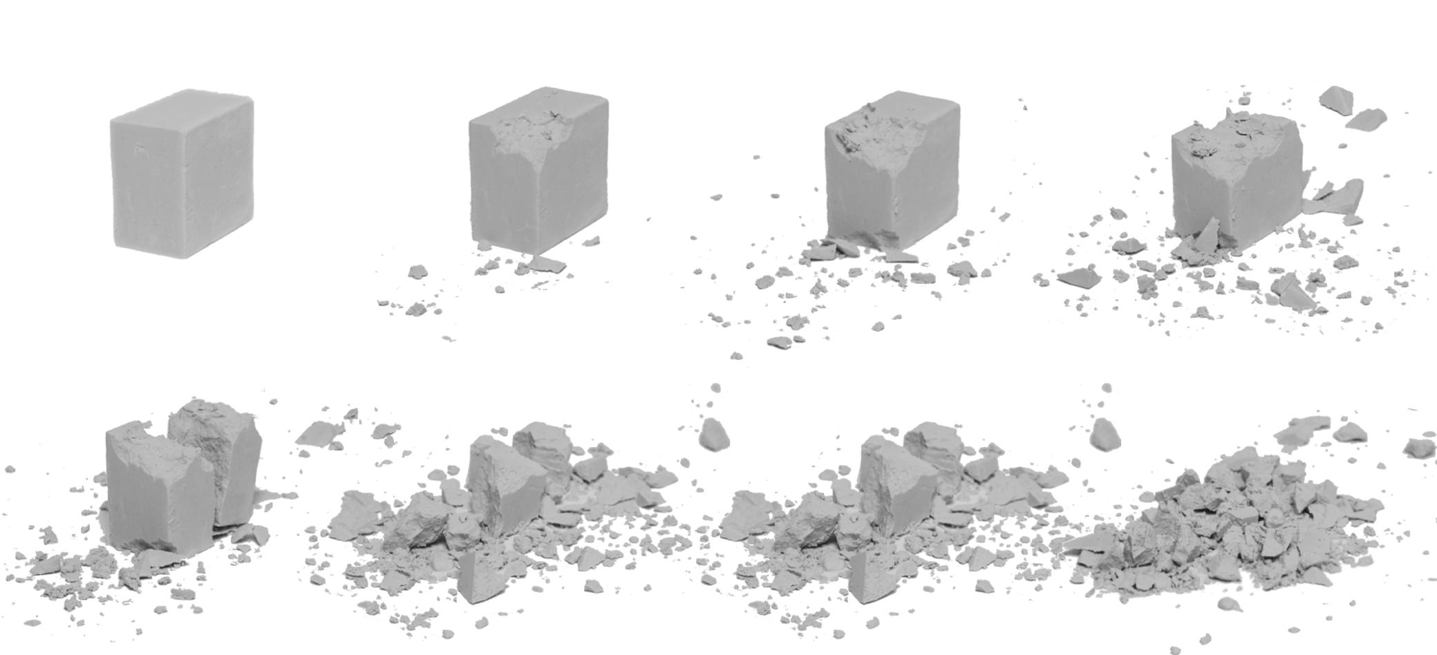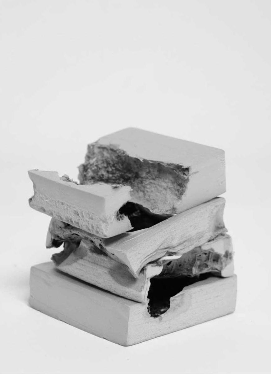 MATERIAL ANALYSIS: The final form of my design was inspired by the remnants of various material erosion experiments. Using acetone on insulation foam mimicked the effects of water on stone. Small plaster blocks were smashed in various ways to determine what forms are created when material crumbles.