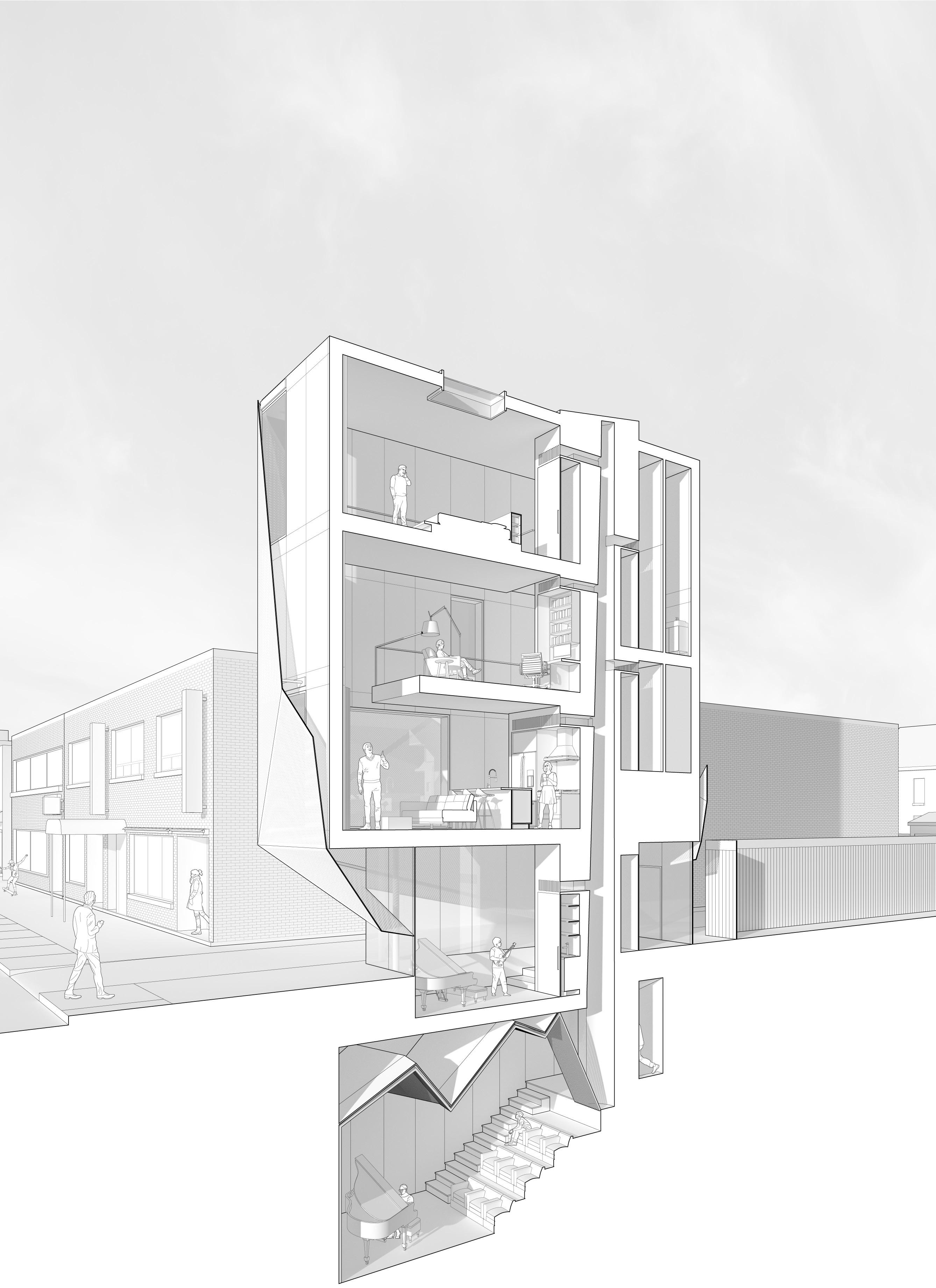 PROGRAM: Opera House is situated on a 3m x 11m lot and is comprised of private and public spaces. The top three floors are residential while the basement is an ampitheatre open to the public. The main floor can be used for music lessons or as a sitting room. Connecting the two spaces is a hollow tube which transmits sound throughout the home.