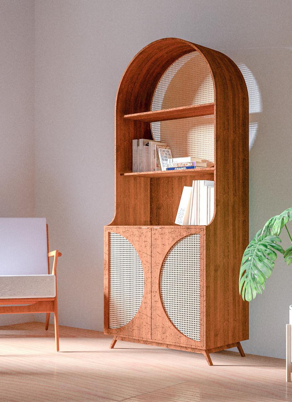 I was originally approached by a friend with the brief of creating a bookshelf design with hidden storage. It had to be small and have a feeling of lightness so that it suits their small Toronto apartment. The final iteration of the bookshelf is intented to be built with wood. There are several components made from rattan that aid in creating a