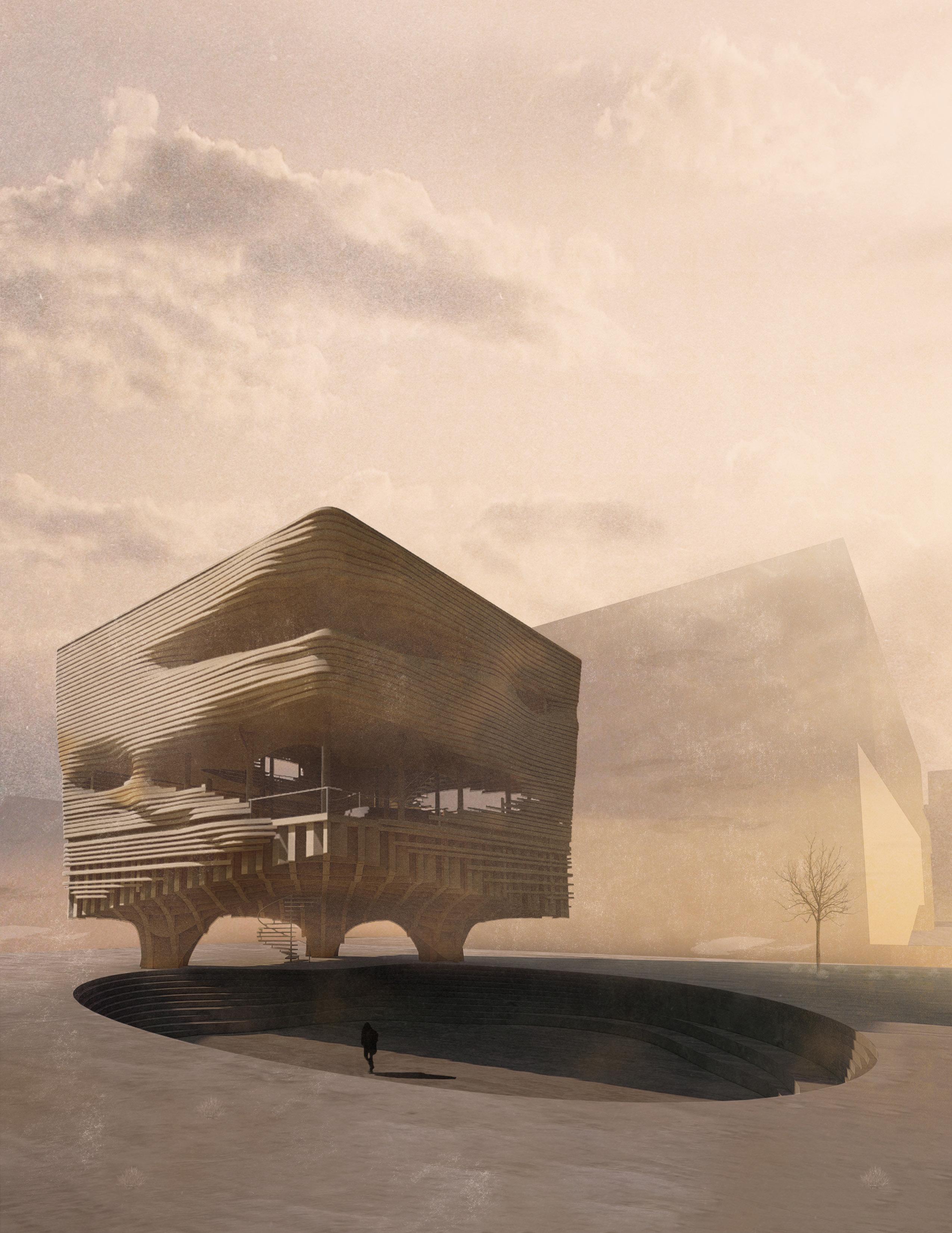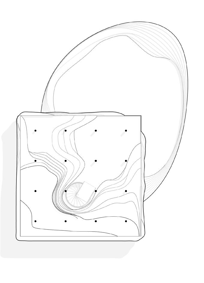 final design. As per project guidelines, the student centre fits within a nine-square grid, with columns at each intersection, and contains a series of spaces for large gatherings, study spaces for two or three persons, and spaces for individuals. Students traverse a sunken ampitheatre and enter the centre from below into a space reminiscent of eroded hills and cliff sides.