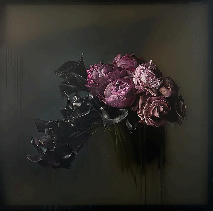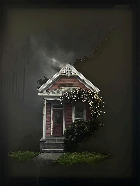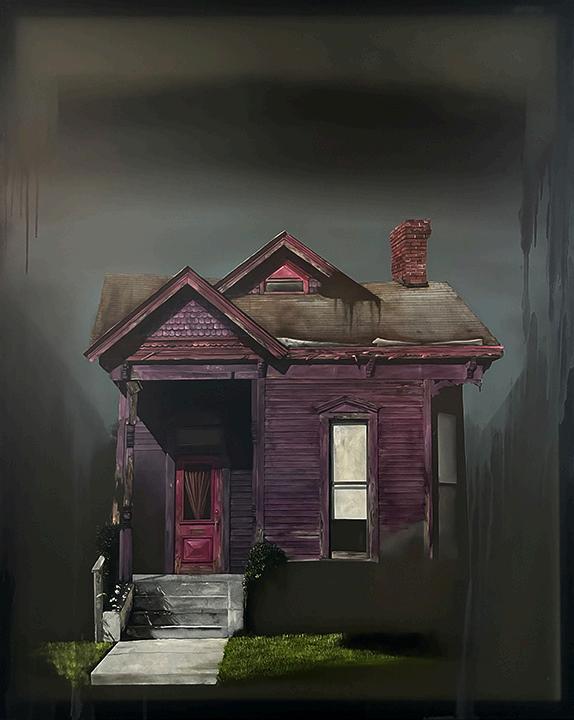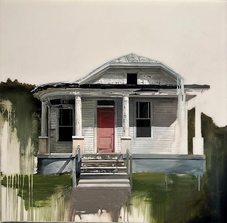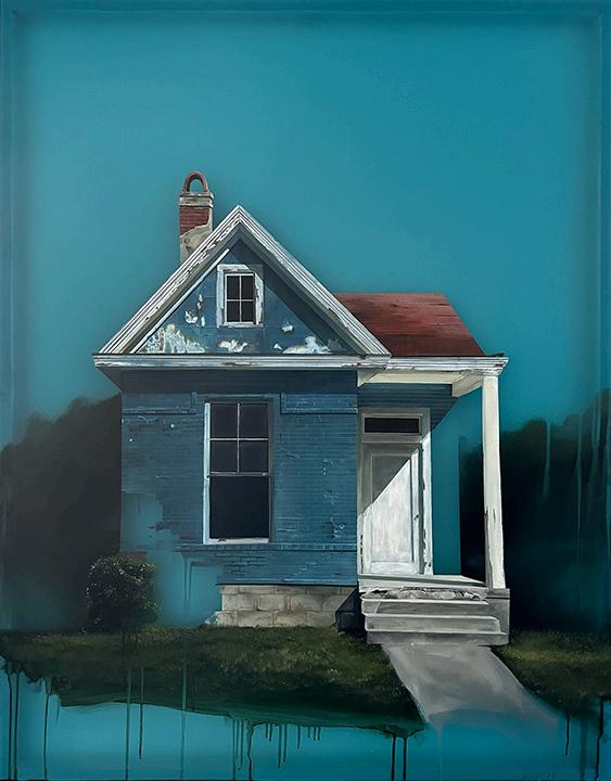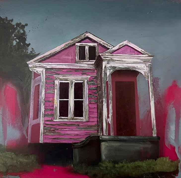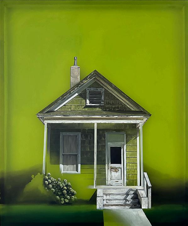 Incoming, Jared Small’s newest collection of paintings, delves into themes of impermanence and fragility with his signature photorealistic depictions. Presented in pairs, each work juxtaposes an aging, weathered house with a vibrant bouquet or single flower in the same color. The fresh, full-bloom florals stand in striking contrast to the slowly eroding bungalows, highlighting the fleeting nature of both manmade and natural beauty. Small’s hyperrealistic style enhances this dialogue, drawing the viewer into a poignant meditation on the passage of time.